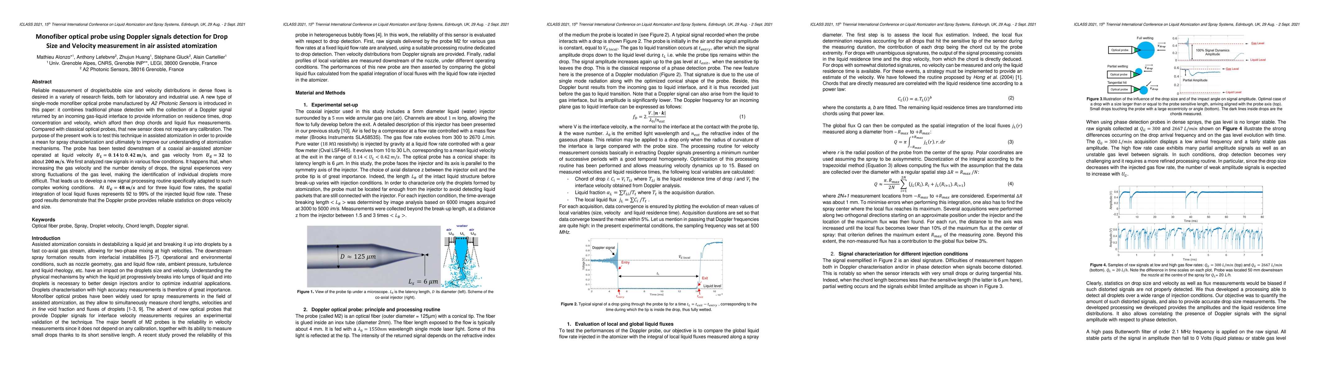 This paper introduces a new monofiber optical probe that combines phase detection with Doppler signal collection for measuring droplet size and velocity in air-assisted atomization. The probe, which does not require calibration, was tested downstream of an air-assisted atomizer, showing reliable statistics on droplet velocity and size, despite signal fluctuations in high gas velocity conditions.