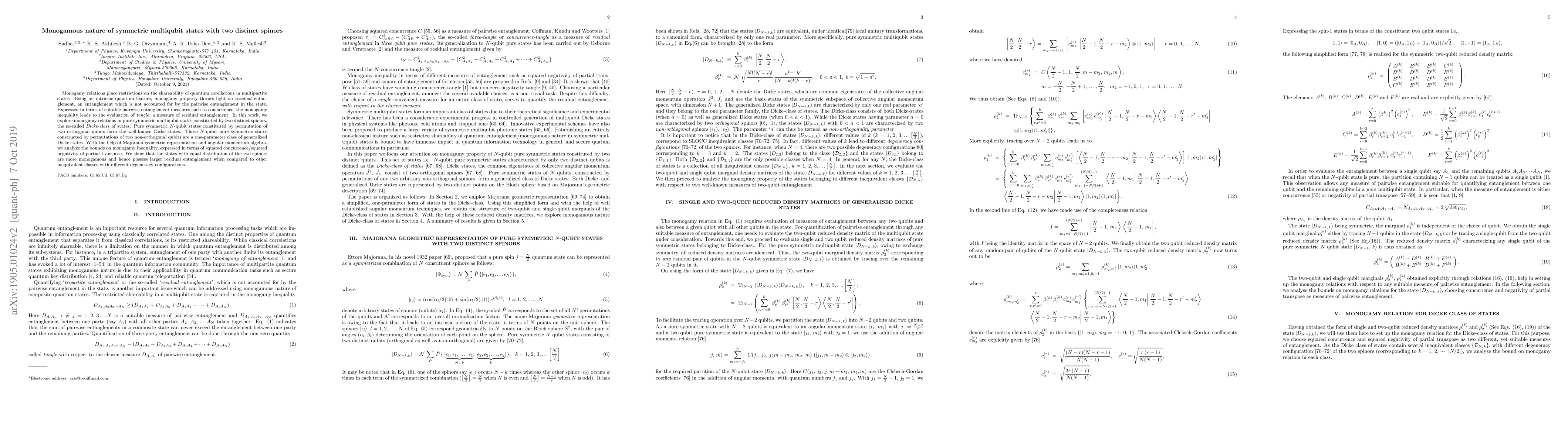 This paper investigates the monogamy relations in pure symmetric multiqubit states formed by two distinct spinors, known as Dicke-class states. It shows that states with equal distribution of the two spinors exhibit stronger monogamy properties and possess greater residual entanglement compared to other configurations.