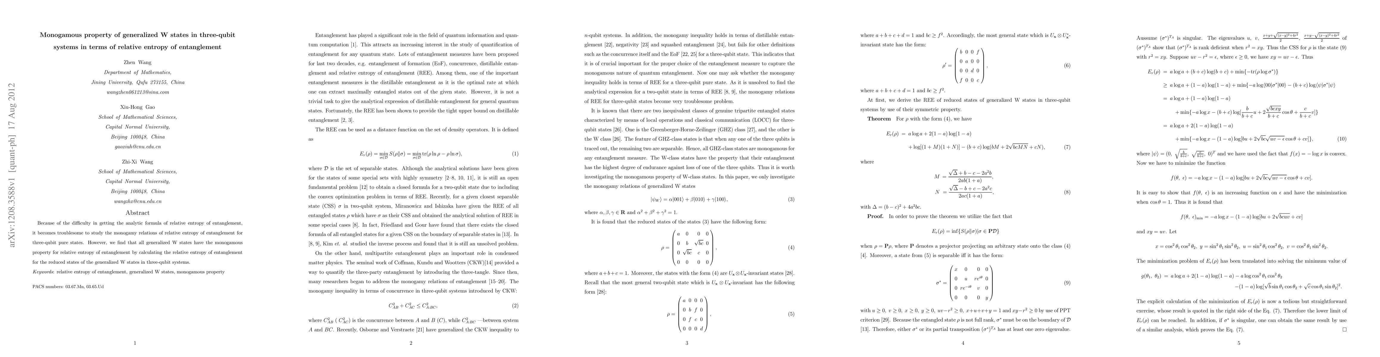 This paper investigates the monogamy relations of relative entropy of entanglement in three-qubit systems, finding that generalized W states exhibit monogamous properties. The study calculates the relative entropy of entanglement for reduced states of these generalized W states to confirm this property.