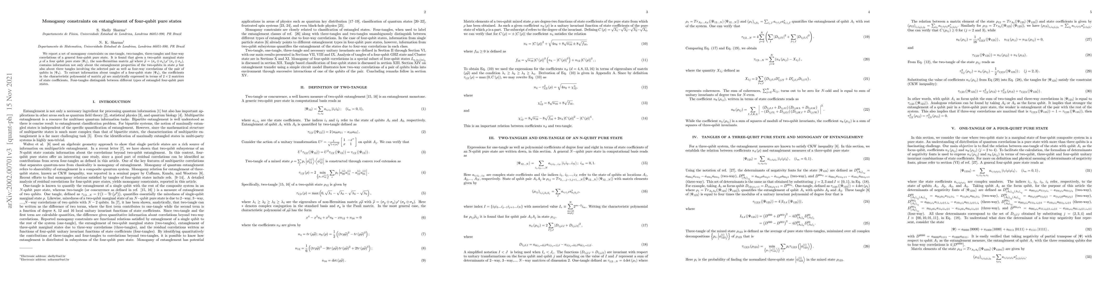 This paper establishes monogamy constraints on entanglement measures for four-qubit pure states, revealing that the non-Hermitian matrix $\rho\widetilde{\rho}$ encapsulates information about two-qubit entanglement, three-tangles, and four-way correlations. Analytical expressions for the coefficients in the characteristic polynomial of $\rho\widetilde{\rho}$ provide insights into the four-tangles, distinguishing various entangled states.