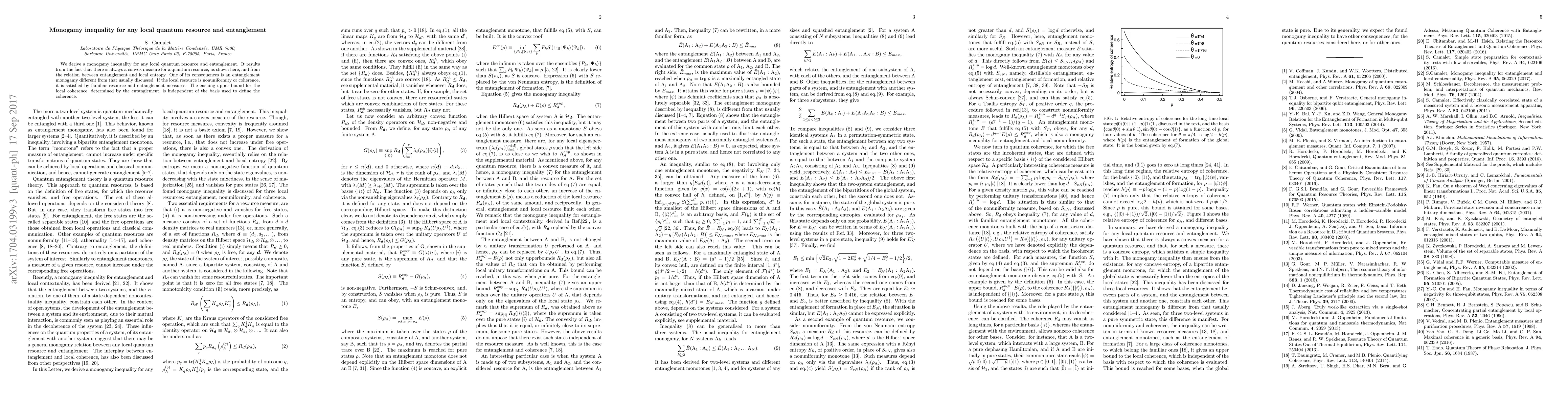 The paper derives a monogamy inequality for any local quantum resource and entanglement by leveraging the existence of a convex measure for a quantum resource and the relationship between entanglement and local entropy.