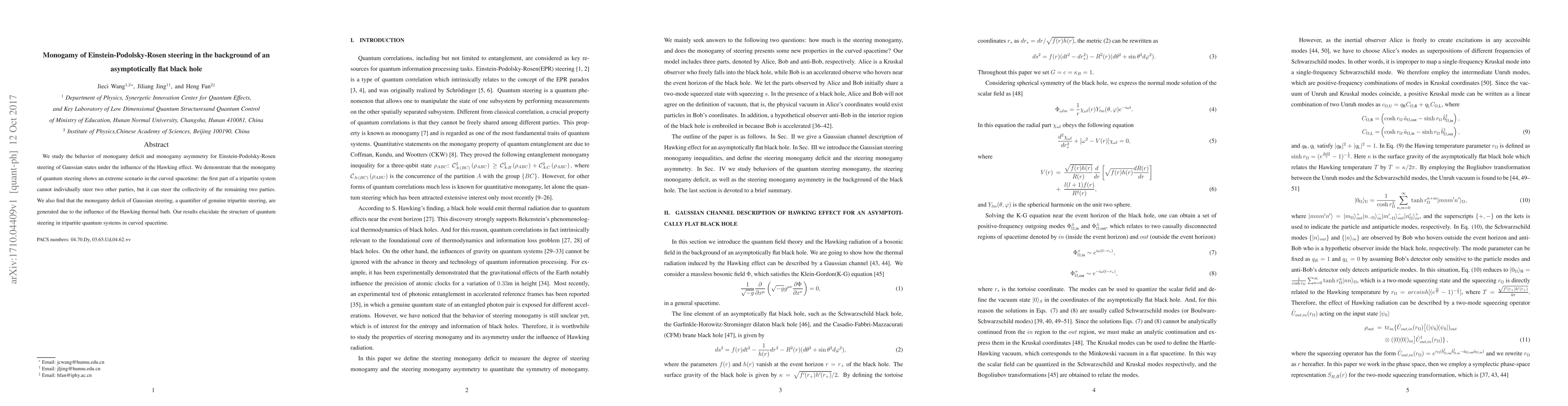 We study the behavior of monogamy deficit and monogamy asymmetry for Einstein-Podolsky-Rosen steering of Gaussian states under the influence of the Hawking effect. We demonstrate that the monogamy of quantum steering shows an extreme scenario in the curved spacetime: the first part of a tripartite system cannot individually steer two other parties, but it can steer the collectivity of the remaining two parties. We also find that the monogamy deficit of Gaussian steering, a quantifier of genuine tripartite steering, are generated due to the influence of the Hawking thermal bath. Our results elucidate the structure of quantum steering in tripartite quantum systems in curved spacetime.
