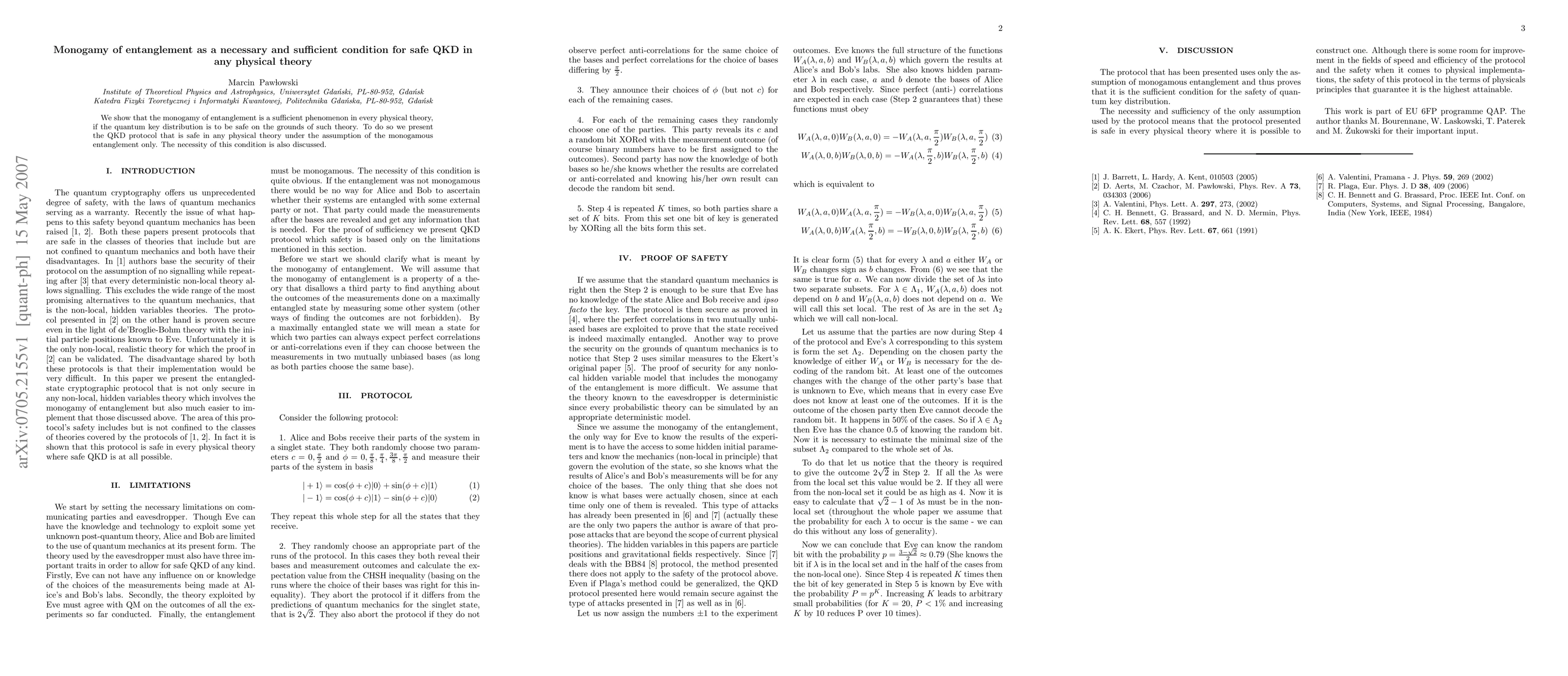 We show that the monogamy of entanglement is a sufficient phenomenon in every physical theory, if the quantum key distribution is to be safe on the grounds of such theory. To do so we present the QKD protocol that is safe in any physical theory under the assumption of the monogamous entanglement only. The necessity of this condition is also discussed.