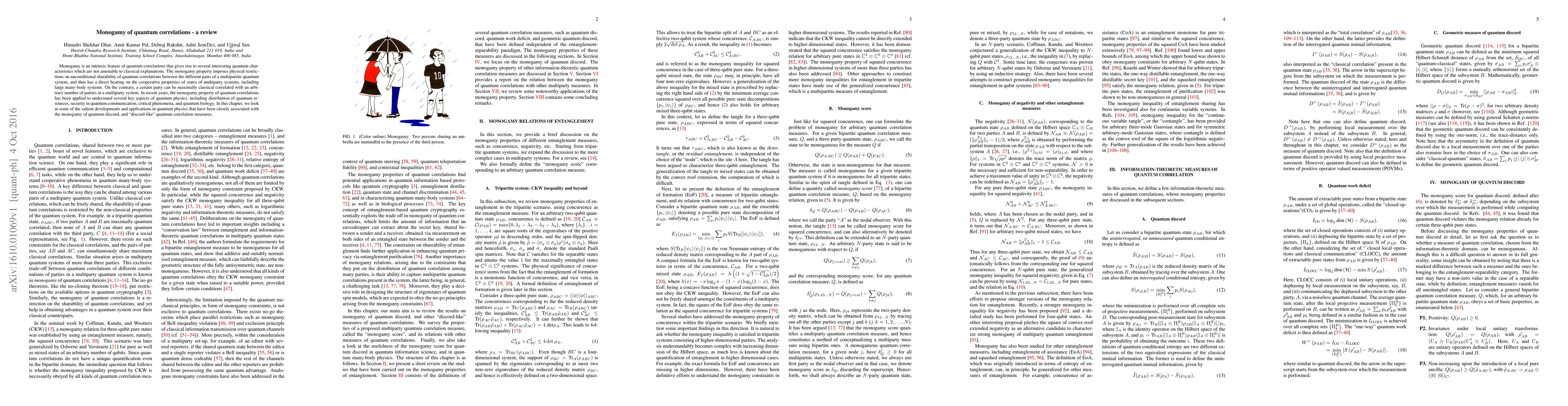 Monogamy is an intrinsic feature of quantum correlations that gives rise to several interesting quantum characteristics which are not amenable to classical explanations. The monogamy property imposes physical restrictions on unconditional sharability of quantum correlations between the different parts of a multipartite quantum system, and thus has a direct bearing on the cooperative properties of states of multiparty systems, including large many-body systems. On the contrary, a certain party can be maximally classical correlated with an arbitrary number of parties in a multiparty system. In recent years, the monogamy property of quantum correlations has been applied to understand several key aspects of quantum physics, including distribution of quantum resources, security in quantum communication, critical phenomena, and quantum biology. In this chapter, we look at some of the salient developments and applications in quantum physics that have been closely associated with the monogamy of quantum discord, and "discord-like" quantum correlation measures.