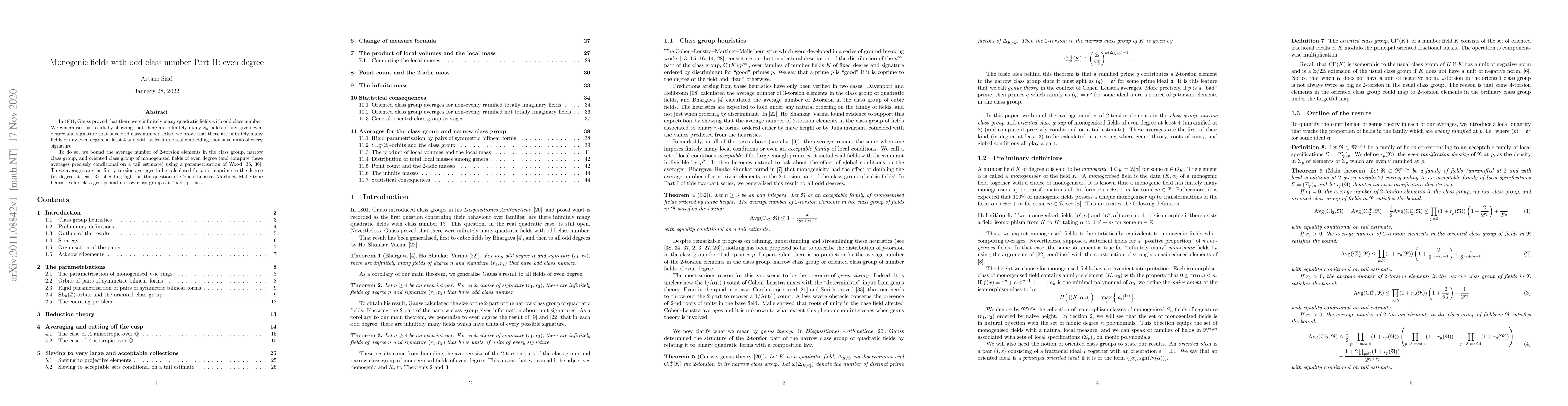 This paper extends Gauss's result on quadratic fields with odd class number to $S_n$-fields of any even degree and signature, proving their infinite existence. It also demonstrates the presence of units of every signature in infinitely many even-degree fields with at least one real embedding, and calculates the average number of $2$-torsion elements in various class groups using Wood's parametrisation.