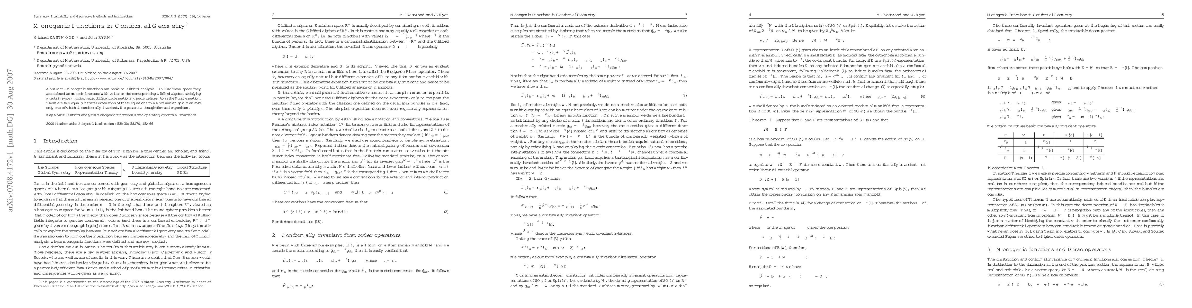 This paper explores monogenic functions in the context of conformal geometry, focusing on their role in Clifford analysis and their extensions to Riemannian spin manifolds, highlighting the unique conformally invariant extension.