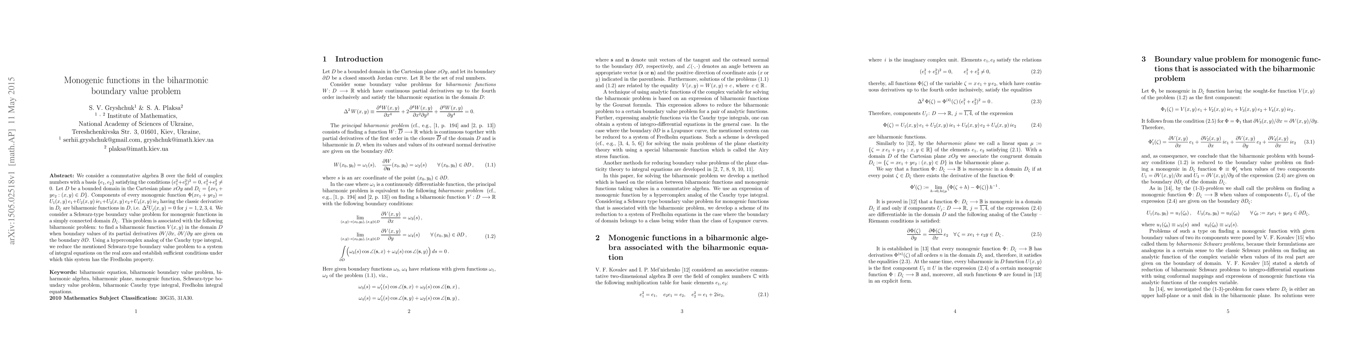 This paper explores the biharmonic boundary value problem for monogenic functions in a commutative algebra $\mathbb{B}$ over complex numbers, showing that the components of these functions are biharmonic in a transformed domain. It establishes a Schwarz-type boundary value problem and uses a hypercomplex analog of the Cauchy type integral to reduce it to a Fredholm system of integral equations.