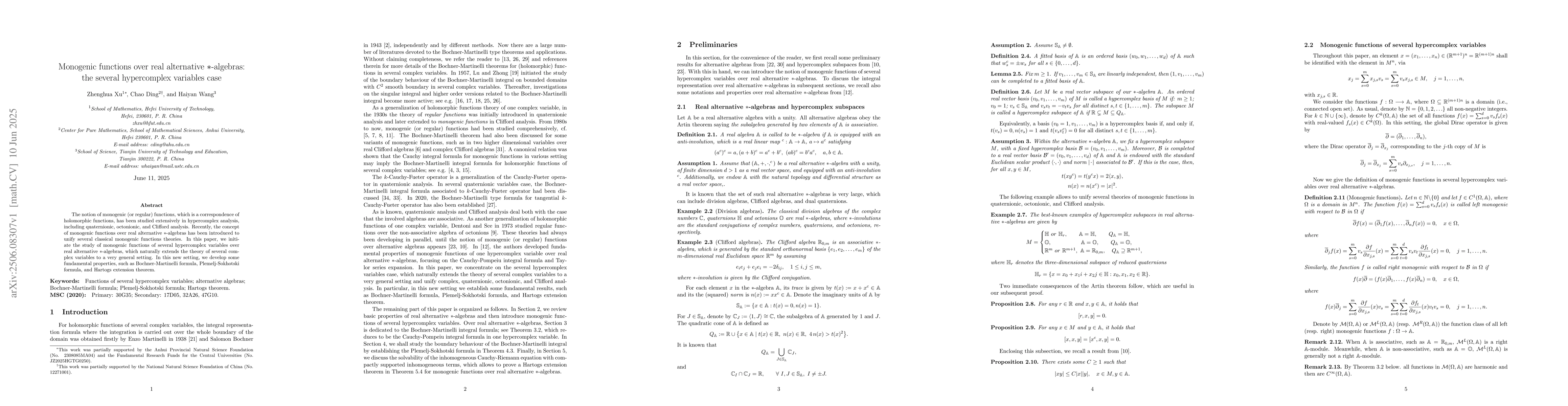 This paper explores monogenic functions over real alternative *-algebras with several hypercomplex variables, extending classical theories to a general setting. It develops fundamental properties like Bochner-Martinelli formula and Hartogs extension theorem.