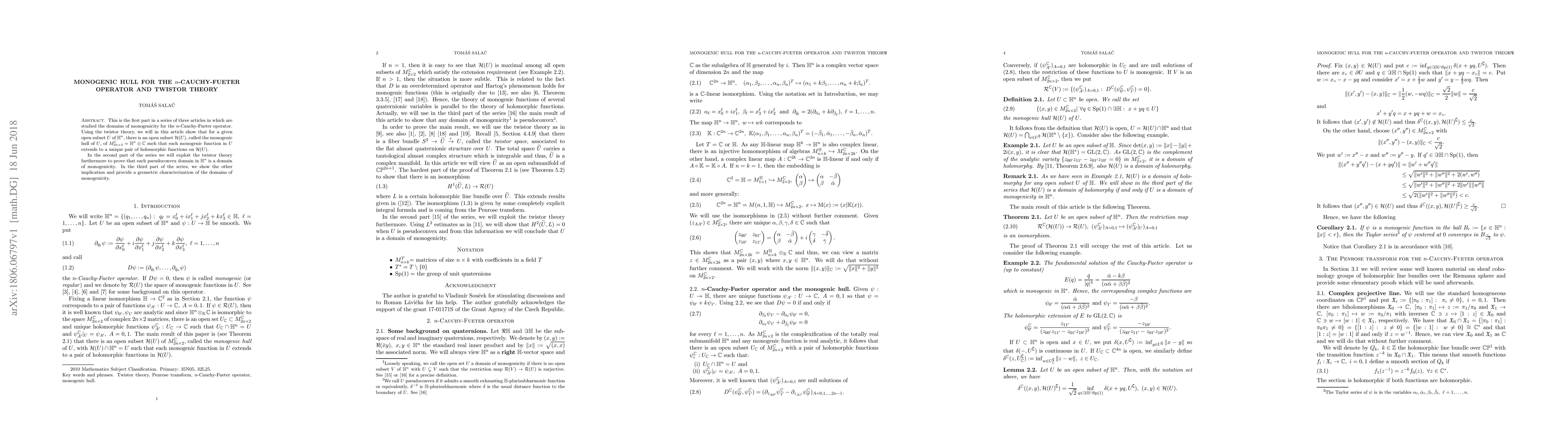This paper introduces the concept of monogenic hull for the $n$-Cauchy-Fueter operator and applies twistor theory to demonstrate that for any open subset $U$ of $\mathbb{Q}^n$, there exists a corresponding monogenic hull $\mathcal{H}(U)$ where each monogenic function in $U$ uniquely extends to holomorphic functions. The study sets the stage for subsequent parts exploring pseudoconvex domains and geometric characterizations.