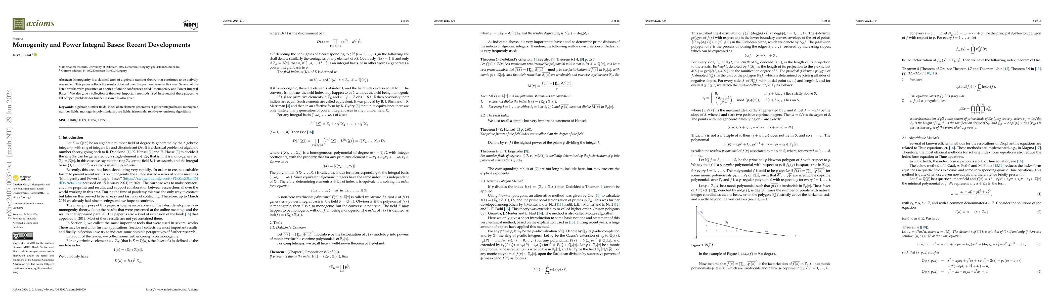 This paper reviews recent advancements in monogenity within algebraic number theory, summarizing significant results presented at online conferences, and outlines prominent methods and open problems for future research.