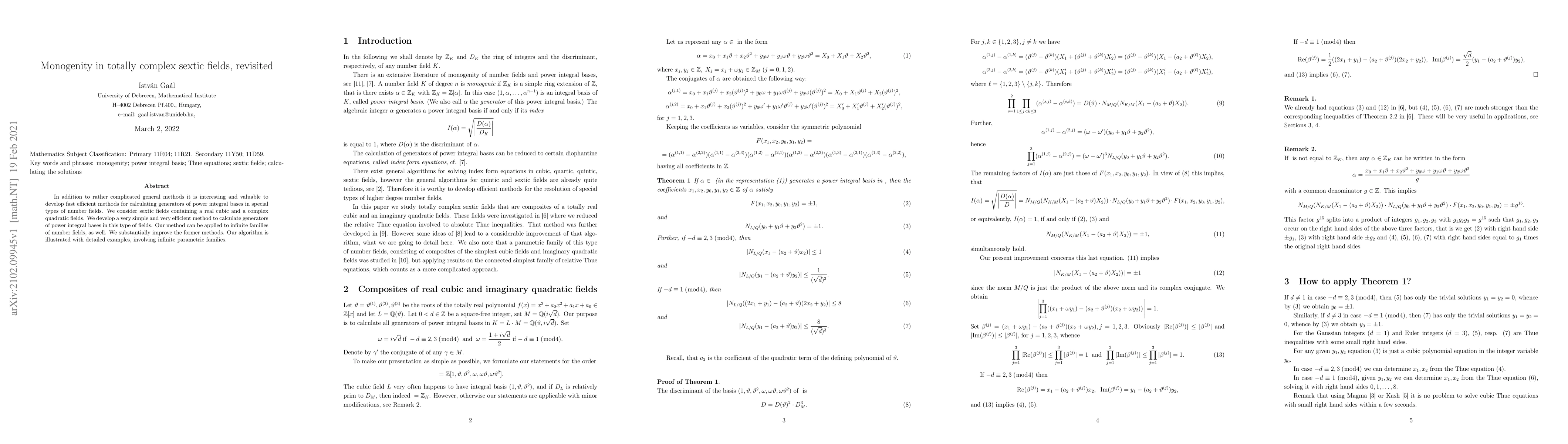 In addition to rather complicated general methods it is interesting and valuable to develop fast efficient methods for calculating generators of power integral bases in special types of number fields. We consider sextic fields containing a real cubic and a complex quadratic fields. We develop a very simple and very efficient method to calculate generators of power integral bases in this type of fields. Our method can be applied to infinite families of number fields, as well. We substantially improve the former methods. Our algorithm is illustrated with detailed examples, involving infinite parametric families.