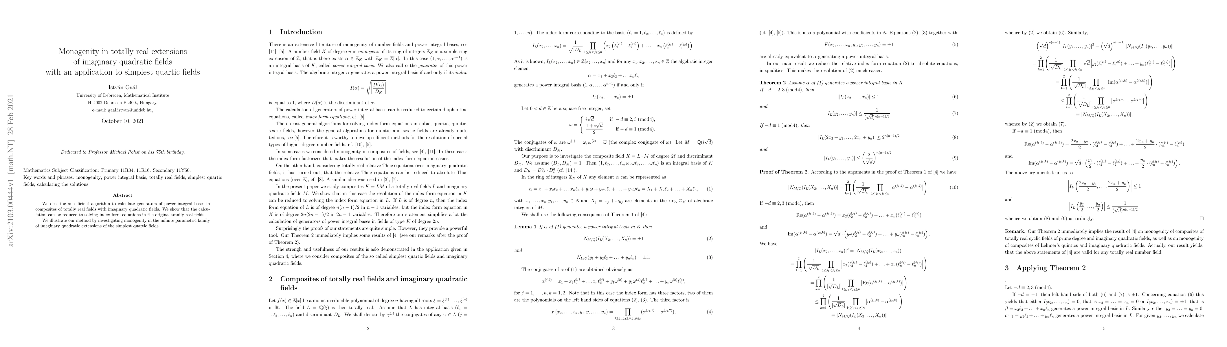 Summary: The paper presents an algorithm for determining generators of power integral bases in composites of totally real fields with imaginary quadratic fields, reducing the problem to solving index form equations. It applies this method to study monogenity in an infinite family of simplest quartic fields.