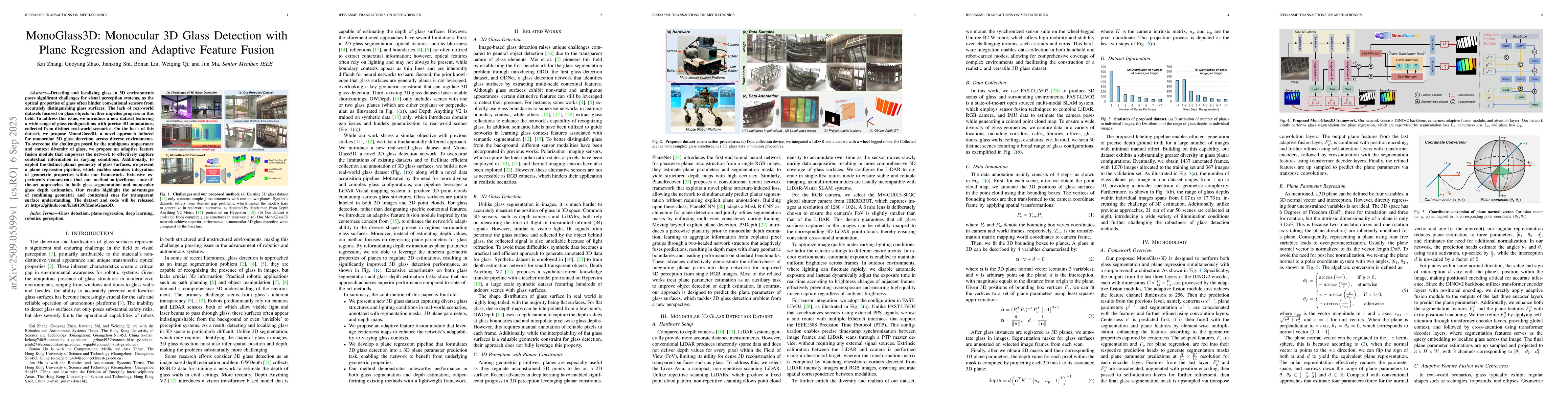 Detecting and localizing glass in 3D environments poses significant challenges for visual perception systems, as the optical properties of glass often hinder conventional sensors from accurately distinguishing glass surfaces. The lack of real-world datasets focused on glass objects further impedes progress in this field. To address this issue, we introduce a new dataset featuring a wide range of glass configurations with precise 3D annotations, collected from distinct real-world scenarios. On the basis of this dataset, we propose MonoGlass3D, a novel approach tailored for monocular 3D glass detection across diverse environments. To overcome the challenges posed by the ambiguous appearance and context diversity of glass, we propose an adaptive feature fusion module that empowers the network to effectively capture contextual information in varying conditions. Additionally, to exploit the distinct planar geometry of glass surfaces, we present a plane regression pipeline, which enables seamless integration of geometric properties within our framework. Extensive experiments demonstrate that our method outperforms state-of-the-art approaches in both glass segmentation and monocular glass depth estimation. Our results highlight the advantages of combining geometric and contextual cues for transparent surface understanding.