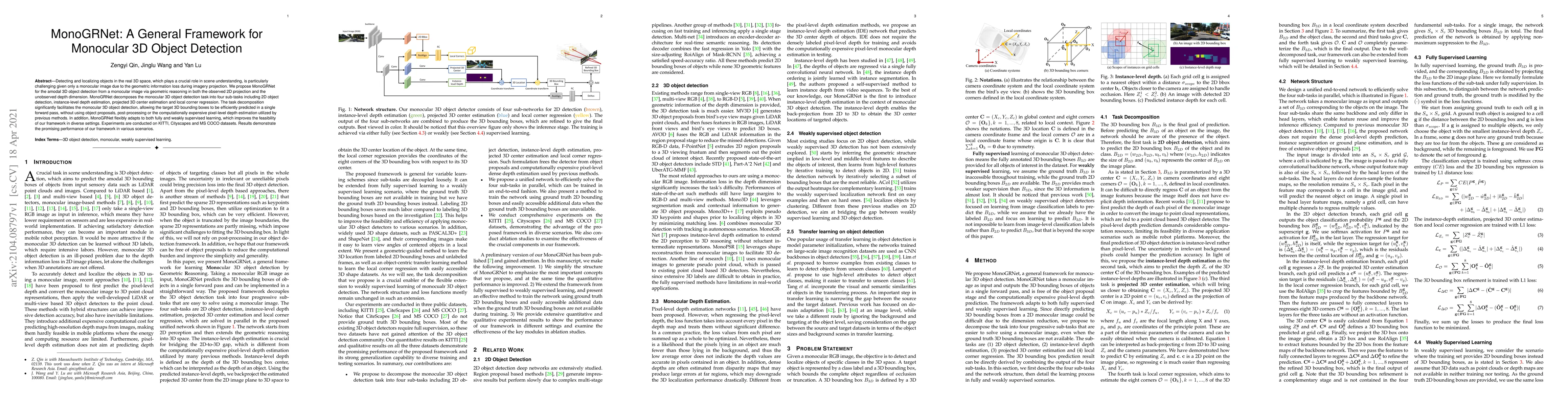 MonoGRNet proposes a general framework for monocular 3D object detection by decomposing the task into four sub-tasks, achieving efficient prediction of 3D bounding boxes without computationally expensive methods. The framework adapts to both fully and weakly supervised learning, demonstrating promising results across multiple datasets.