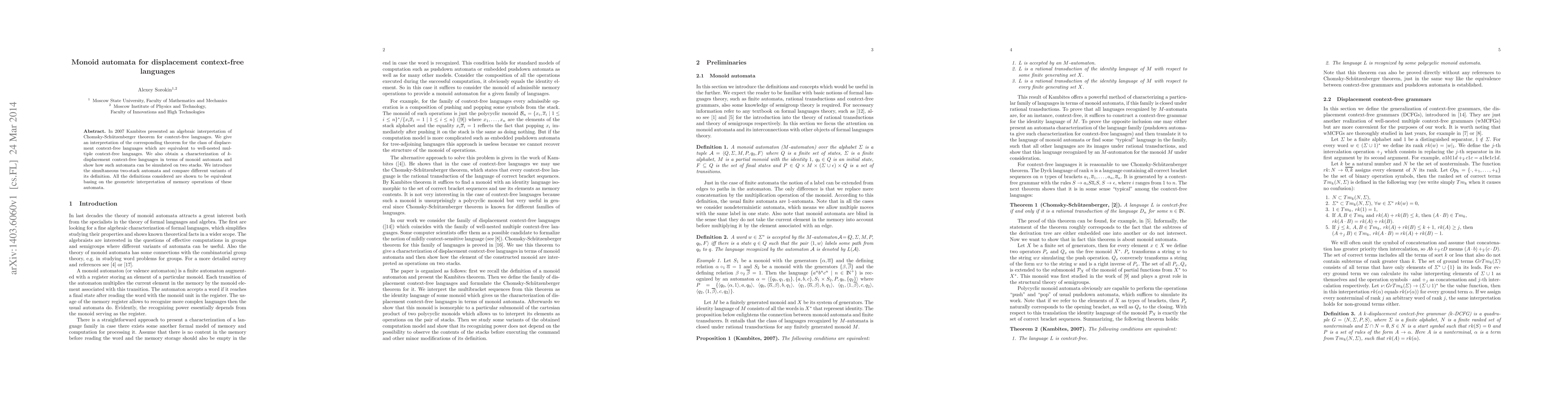 This paper presents an algebraic interpretation of the Chomsky-Schützenberger theorem for displacement context-free languages using monoid automata. It characterizes k-displacement context-free languages via monoid automata and demonstrates their simulation on two stacks, introducing and comparing various definitions of simultaneous two-stack automata.