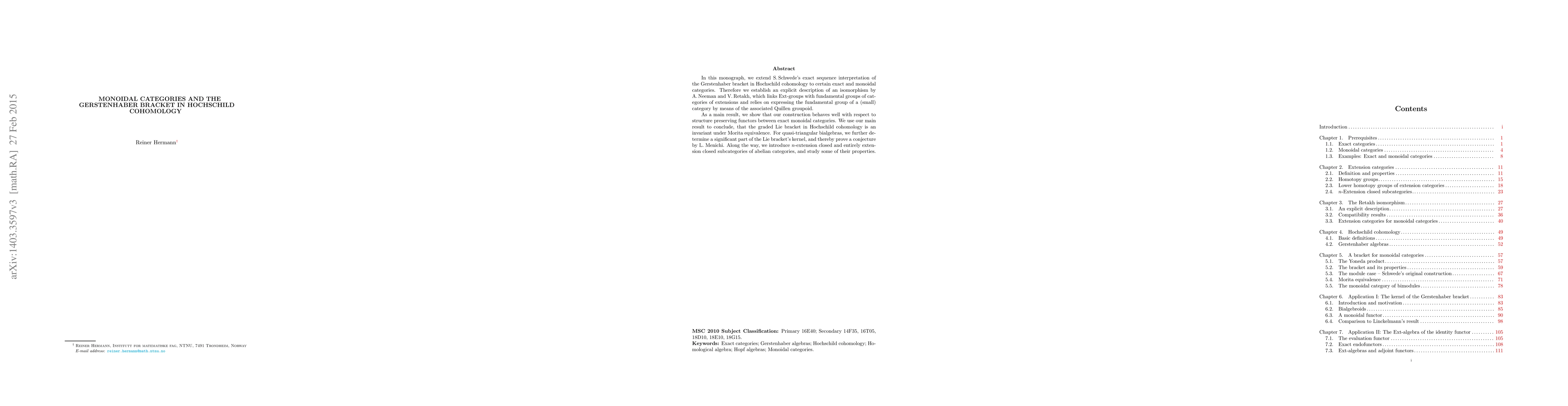 This paper extends the Gerstenhaber bracket in Hochschild cohomology to exact and monoidal categories, establishing an isomorphism relating $\mathrm{Ext}$-groups with fundamental groups via Quillen groupoids. It demonstrates the invariance of the Lie bracket and squaring map under Morita equivalence, proving a conjecture related to quasi-triangular bialgebras' Lie bracket kernels.