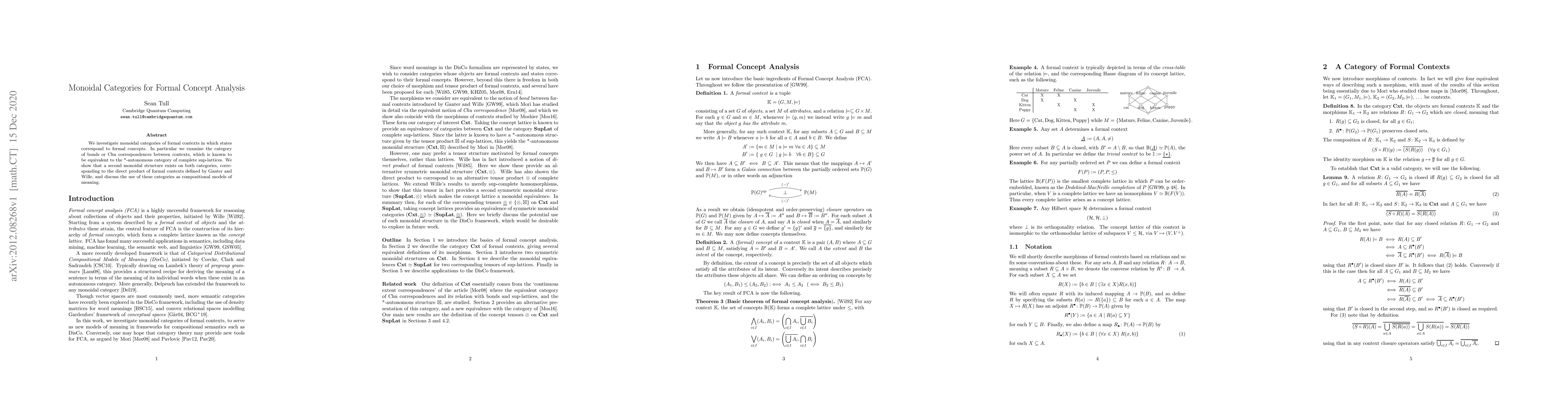 This paper explores monoidal categories applied to formal concept analysis, focusing on the category of bonds between contexts, which parallels the *-autonomous category of complete sup-lattices. It also introduces a second monoidal structure based on the direct product of formal contexts, proposing these categories as compositional models for meaning.