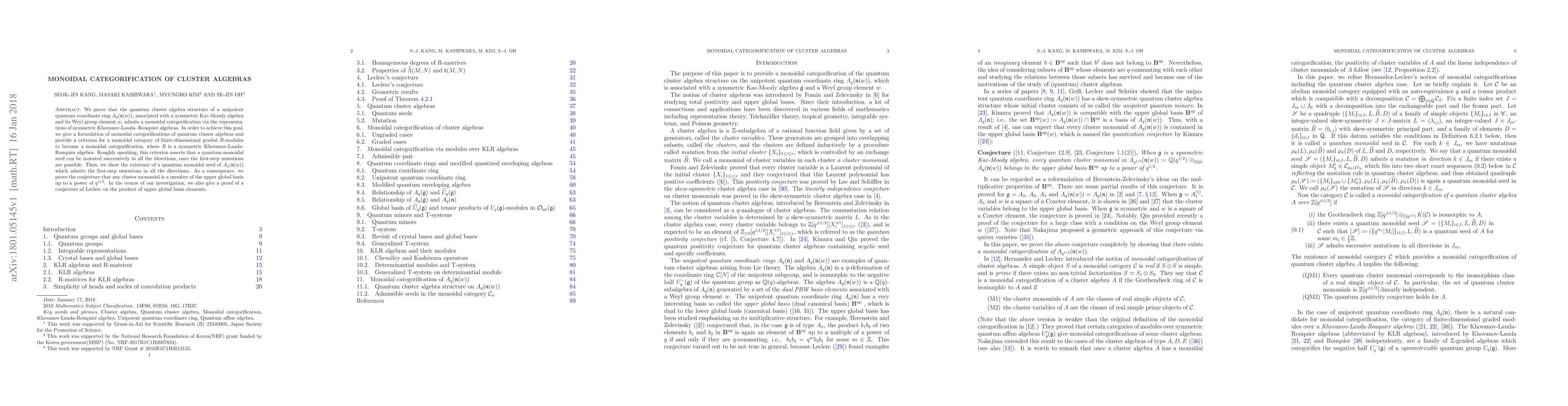 The paper demonstrates a monoidal categorification of quantum cluster algebras using representations of symmetric Khovanov-Lauda-Rouquier algebras, proving that any cluster monomial belongs to the upper global basis up to a power of $q^{1/2}$. It also verifies a conjecture regarding the product of upper global basis elements.