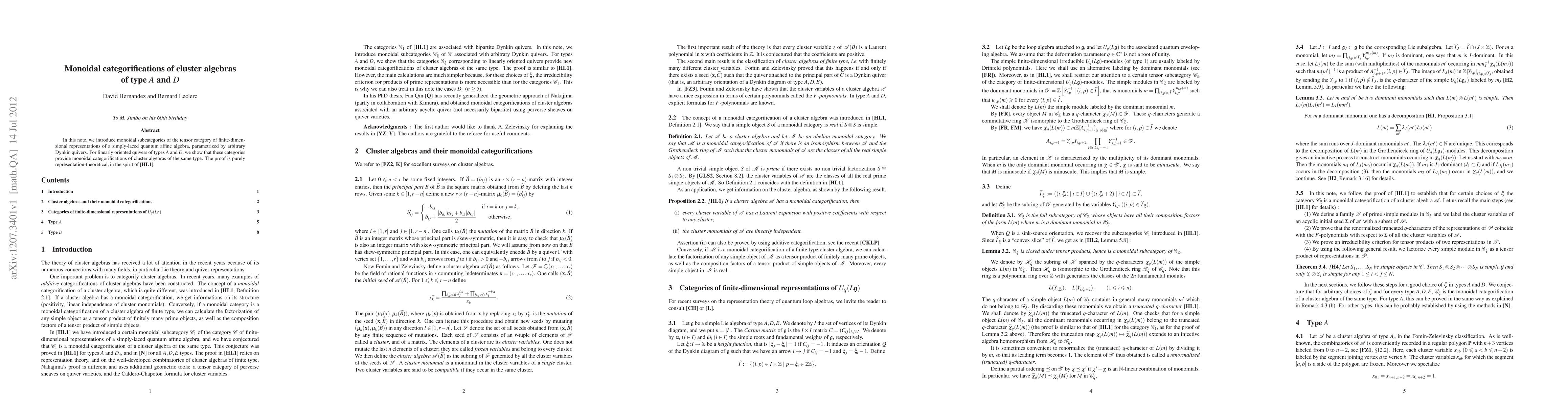 In this note, we introduce monoidal subcategories of the tensor category of finite-dimensional representations of a simply-laced quantum affine algebra, parametrized by arbitrary Dynkin quivers. For linearly oriented quivers of types A and D, we show that these categories provide monoidal categorifications of cluster algebras of the same type. The proof is purely representation-theoretical, in the spirit of [arXiv:0903.1452].