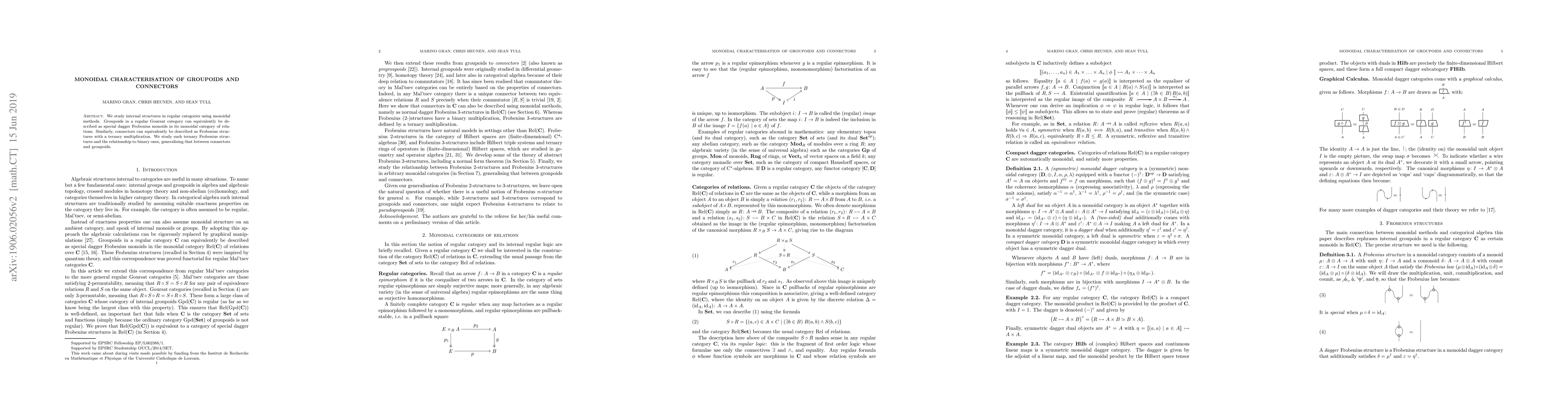 This paper explores the monoidal characterisation of groupoids and connectors within regular categories, showing that groupoids correspond to dagger Frobenius monoids in the monoidal category of relations, while connectors are equivalent to ternary Frobenius structures. It generalises the relationship between connectors and groupoids.