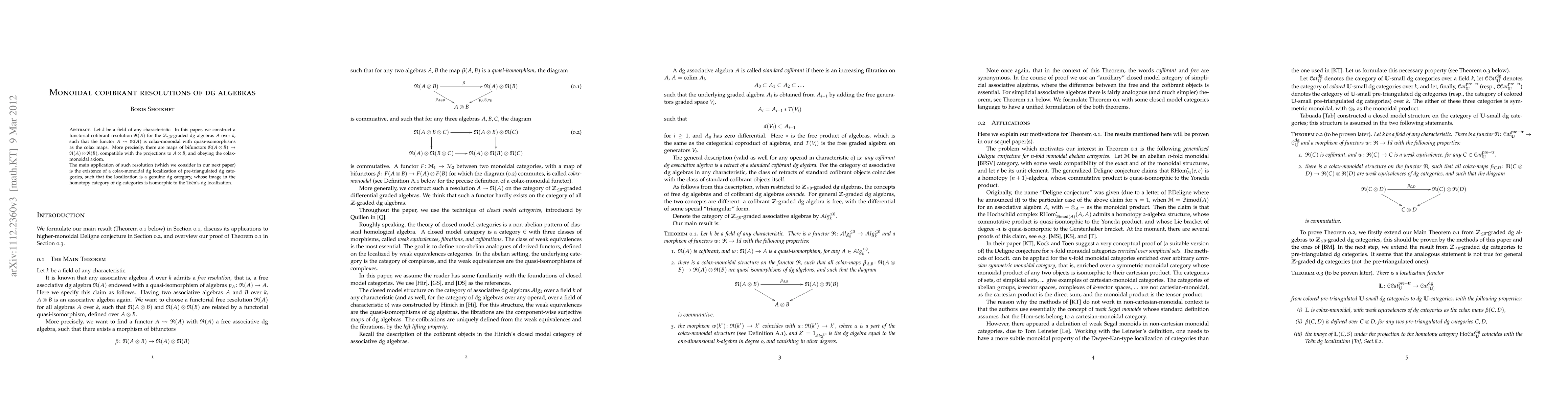 Let $k$ be a field of any characteristic. In this paper, we construct a functorial cofibrant resolution $\mathfrak{R}(A)$ for the $\mathbb{Z}_{\le 0}$-graded dg algebras $A$ over $k$, such that the functor $A\rightsquigarrow \mathfrak{R}(A)$ is colax-monoidal with quasi-isomorphisms as the colax maps. More precisely, there are maps of bifunctors $\mathfrak{R}(A\otimes B)\to \mathfrak{R}(A)\otimes \mathfrak{R}(B)$, compatible with the projections to $A\otimes B$, and obeying the colax-monoidal axiom. The main application of such resolutions (which we consider in our next paper) is the existence of a colax-monoidal dg localization of pre-triangulated dg categories, such that the localization is a genuine dg category, whose image in the homotopy category of dg categories is isomorphic to the To\"{e}n's dg localization.