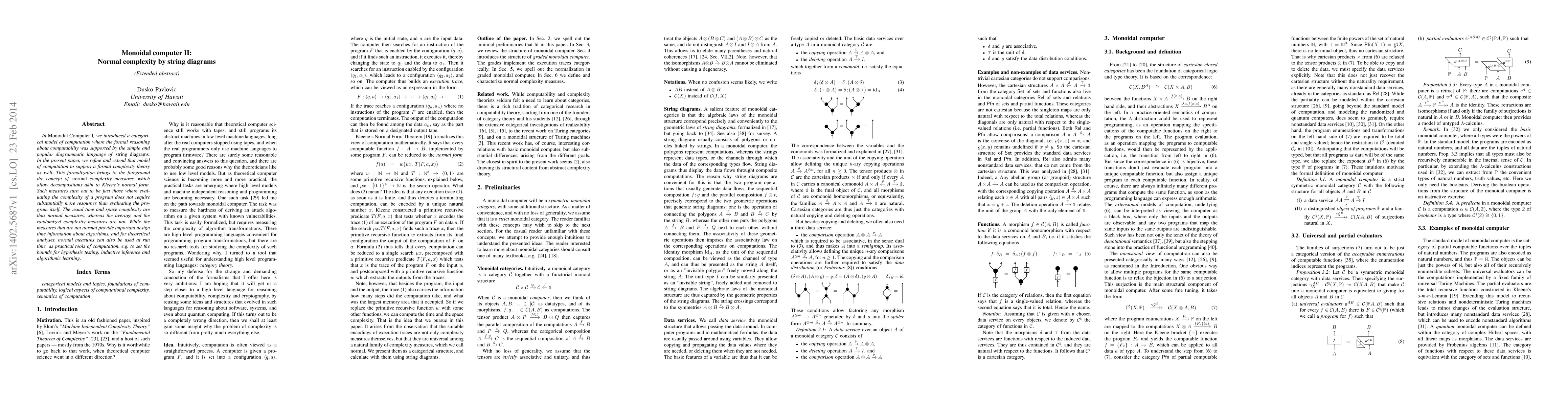 In Monoidal Computer I, we introduced a categorical model of computation where the formal reasoning about computability was supported by the simple and popular diagrammatic language of string diagrams. In the present paper, we refine and extend that model of computation to support a formal complexity theory as well. This formalization brings to the foreground the concept of normal complexity measures, which allow decompositions akin to Kleene's normal form. Such measures turn out to be just those where evaluating the complexity of a program does not require substantially more resources than evaluating the program itself. The usual time and space complexity are thus normal measures, whereas the average and the randomized complexity measures are not. While the measures that are not normal provide important design time information about algorithms, and for theoretical analyses, normal measures can also be used at run time, as practical tools of computation, e.g. to set the bounds for hypothesis testing, inductive inference and algorithmic learning.