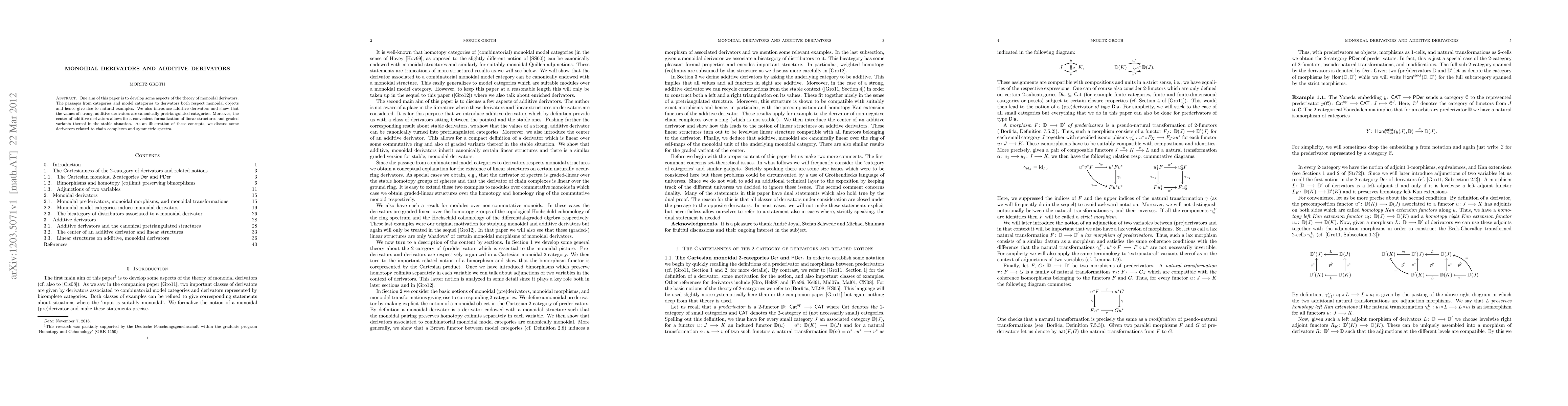One aim of this paper is to develop some aspects of the theory of monoidal derivators. The passages from categories and model categories to derivators both respect monoidal objects and hence give rise to natural examples. We also introduce additive derivators and show that the values of strong, additive derivators are canonically pretriangulated categories. Moreover, the center of additive derivators allows for a convenient formalization of linear structures and graded variants thereof in the stable situation. As an illustration of these concepts, we discuss some derivators related to chain complexes and symmetric spectra.