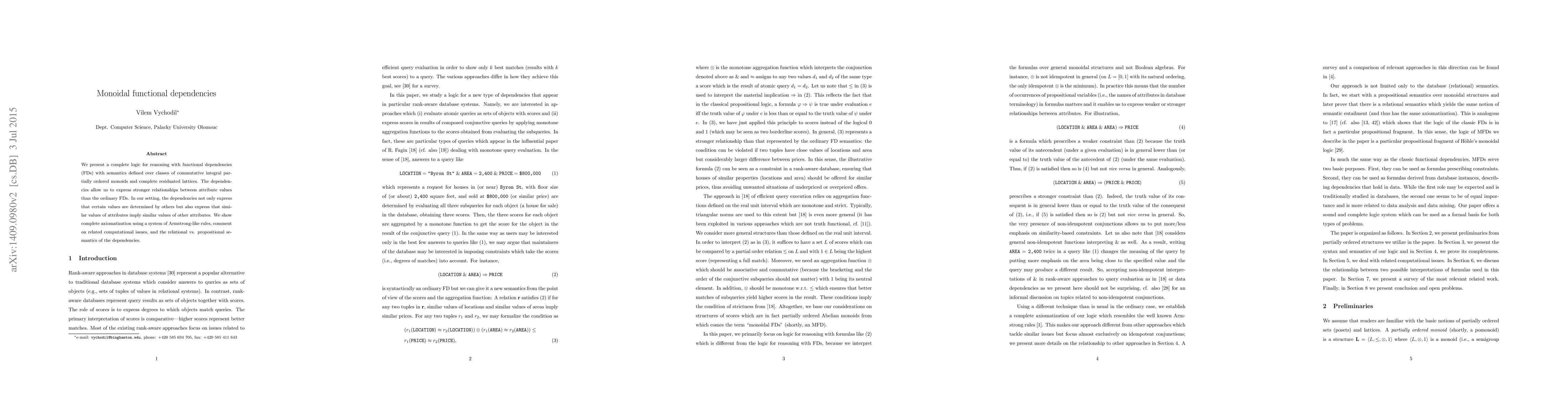 This paper introduces a novel logic for functional dependencies over commutative integral partially ordered monoids and complete residuated lattices, allowing for stronger attribute value relationships than standard FDs. It provides a complete axiomatization with Armstrong-like rules and discusses computational aspects and semantics differences.