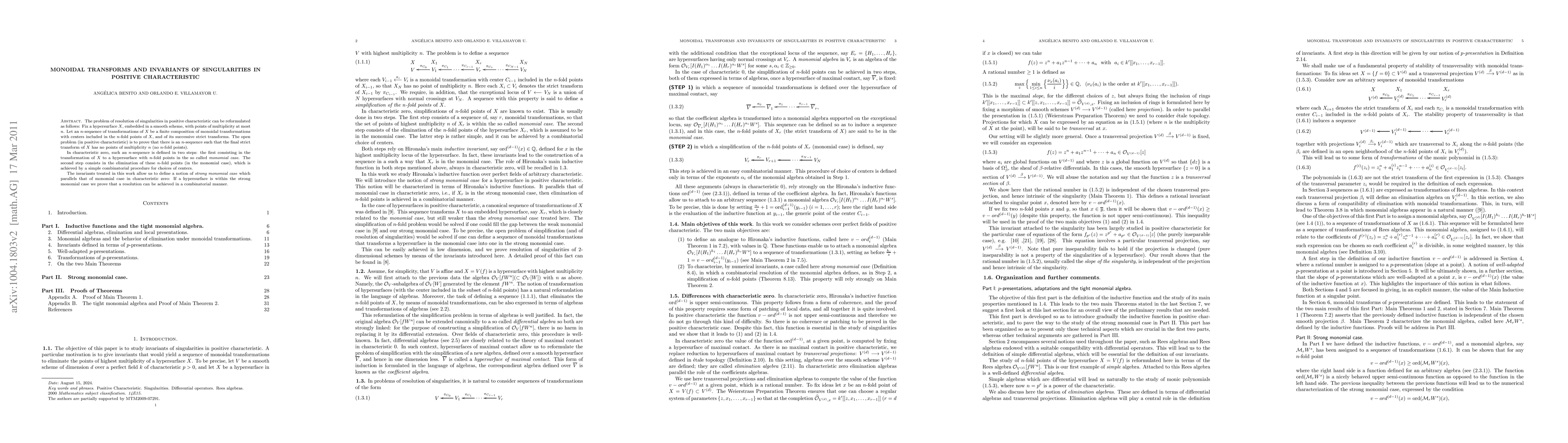 This paper investigates the resolution of singularities in positive characteristic by exploring monoidal transforms and invariants. It establishes a method to resolve singularities in a "strong monomial case" analogous to characteristic zero, proving that such resolutions can be achieved combinatorially.