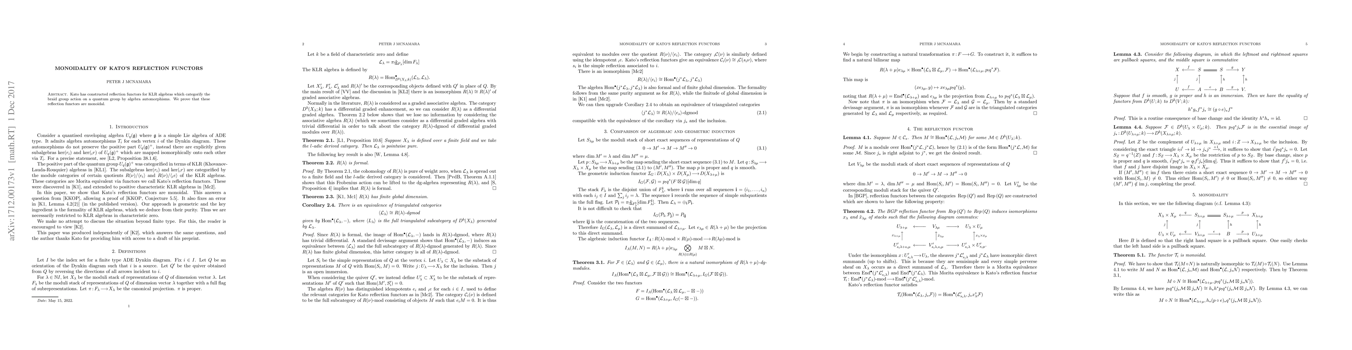 Summary: This paper demonstrates that Kato's reflection functors for KLR algebras, which categorify the braid group action on quantum groups, are indeed monoidal. This establishes a structural property that supports their algebraic and categorical significance.