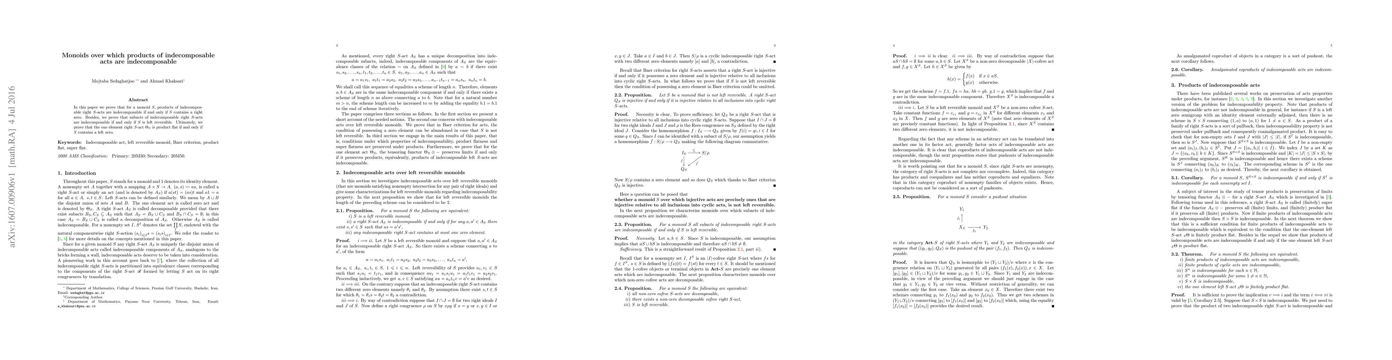 In this paper we prove that for a monoid $S$, products of indecomposable right $S$-acts are indecomposable if and only if $S$ contains a right zero. Besides, we prove that subacts of indecomposable right $S$-acts are indecomposable if and only if $S$ is left reversible. Ultimately, we prove that the one element right $S$-act $\Theta_S$ is product flat if and only if $S$ contains a left zero.
