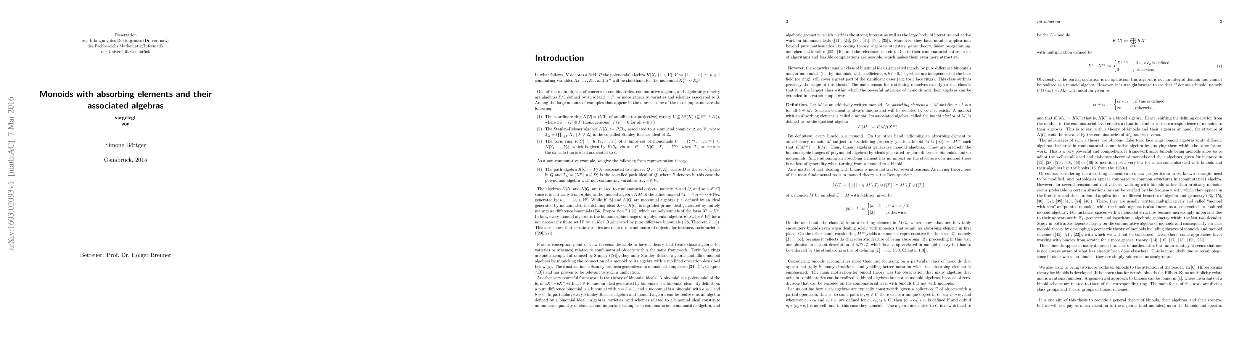 Combinatorial and topological aspects of monoids with an absorbing element and their associated algebras are considered. Phd thesis.