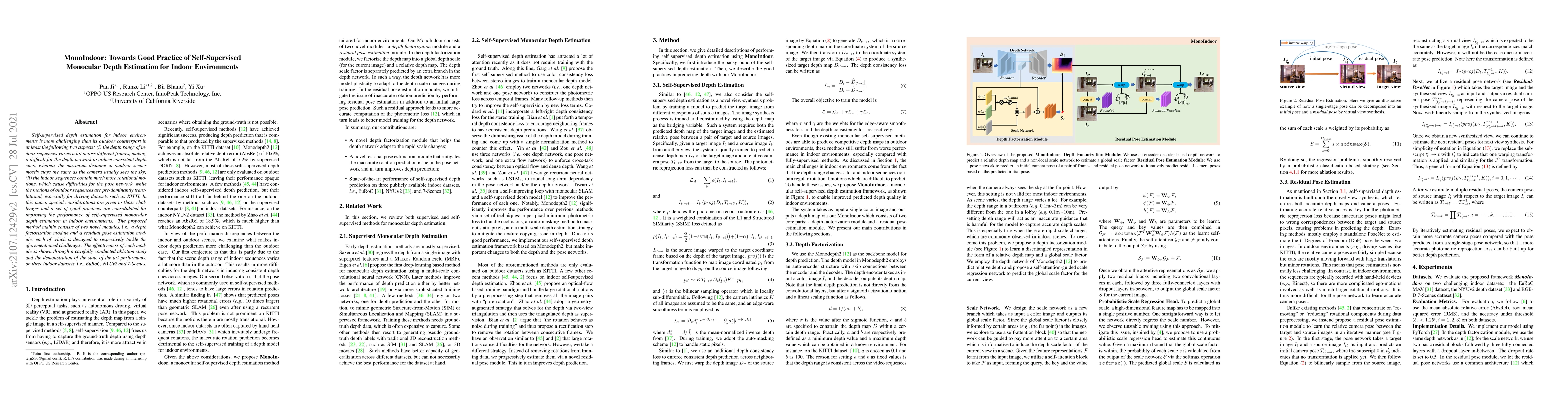 This paper proposes a self-supervised monocular depth estimation method for indoor environments, addressing challenges like varying depth ranges and rotational motions. It introduces two key modules: a depth factorization module and a residual pose estimation module, achieving state-of-the-art performance on three indoor datasets.