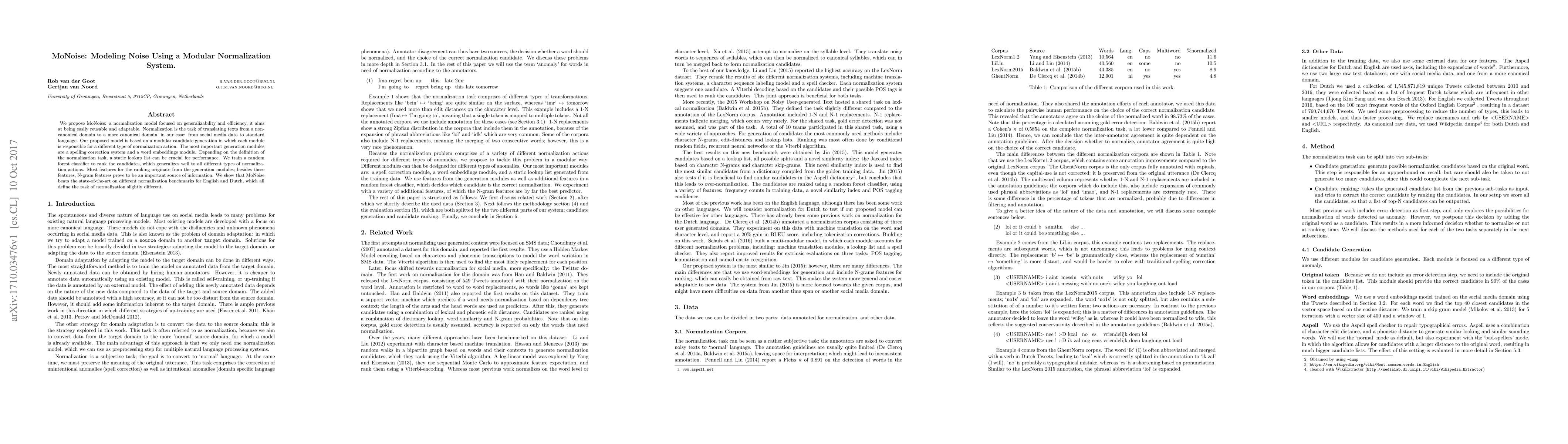 We propose MoNoise: a normalization model focused on generalizability and efficiency, it aims at being easily reusable and adaptable. Normalization is the task of translating texts from a non- canonical domain to a more canonical domain, in our case: from social media data to standard language. Our proposed model is based on a modular candidate generation in which each module is responsible for a different type of normalization action. The most important generation modules are a spelling correction system and a word embeddings module. Depending on the definition of the normalization task, a static lookup list can be crucial for performance. We train a random forest classifier to rank the candidates, which generalizes well to all different types of normaliza- tion actions. Most features for the ranking originate from the generation modules; besides these features, N-gram features prove to be an important source of information. We show that MoNoise beats the state-of-the-art on different normalization benchmarks for English and Dutch, which all define the task of normalization slightly different.