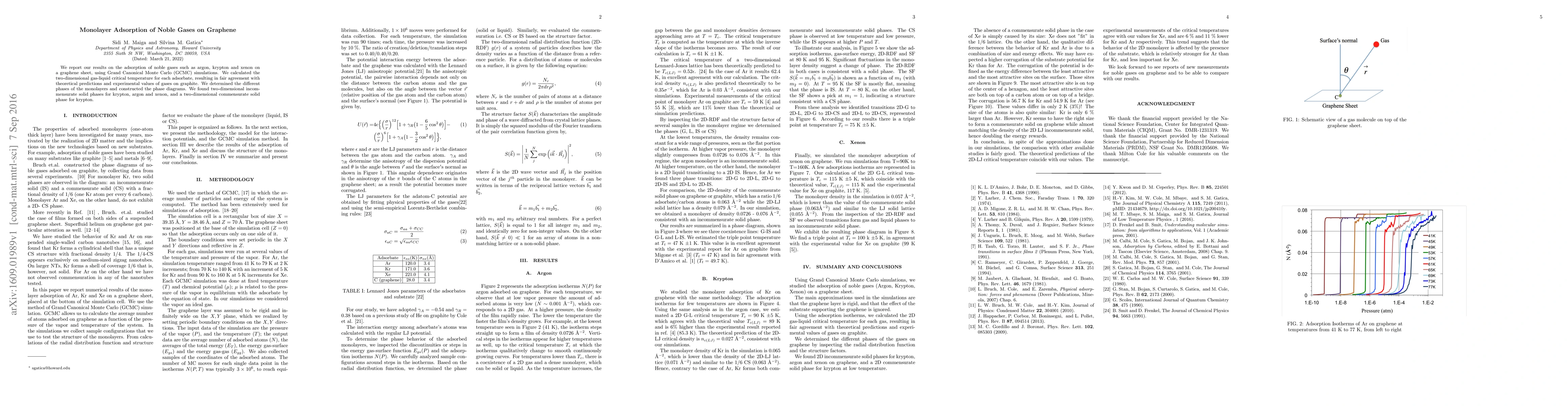 This study uses Grand Canonical Monte Carlo simulations to investigate the monolayer adsorption of noble gases (argon, krypton, and xenon) on graphene, determining their critical temperatures and phase diagrams. The research identifies two-dimensional incommensurate solid phases for argon, krypton, and xenon, with krypton also exhibiting a commensurate solid phase.