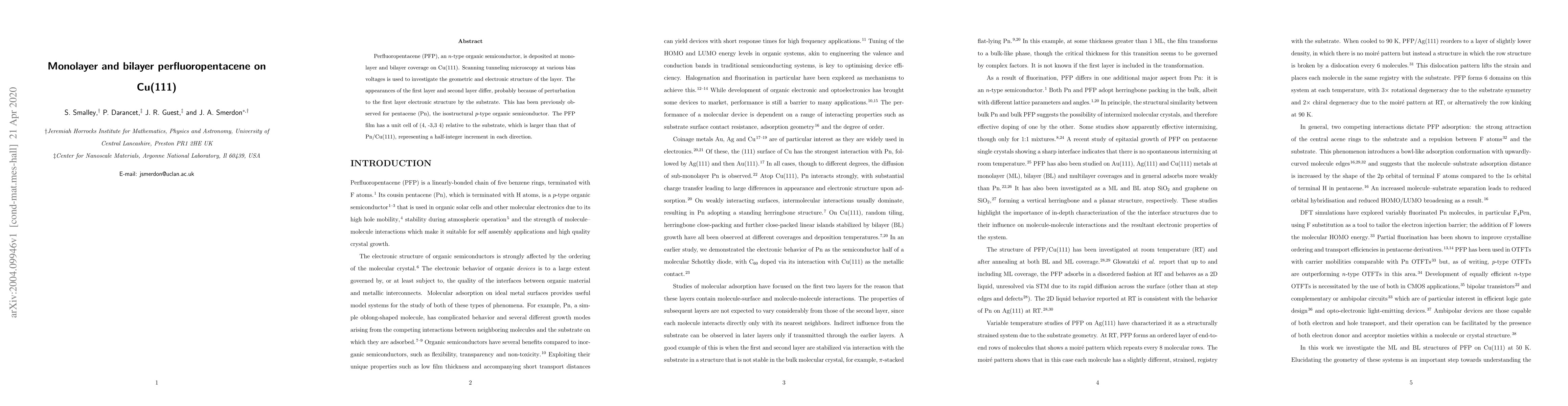 The study investigates monolayer and bilayer perfluoropentacene (PFP) on Cu(111) using scanning tunneling microscopy, revealing distinct geometric and electronic structures between the first and second layers likely due to substrate-induced electronic perturbation. The PFP film exhibits a unit cell larger than that of pentacene on the same substrate, indicating a half-integer increment in the lattice dimensions.