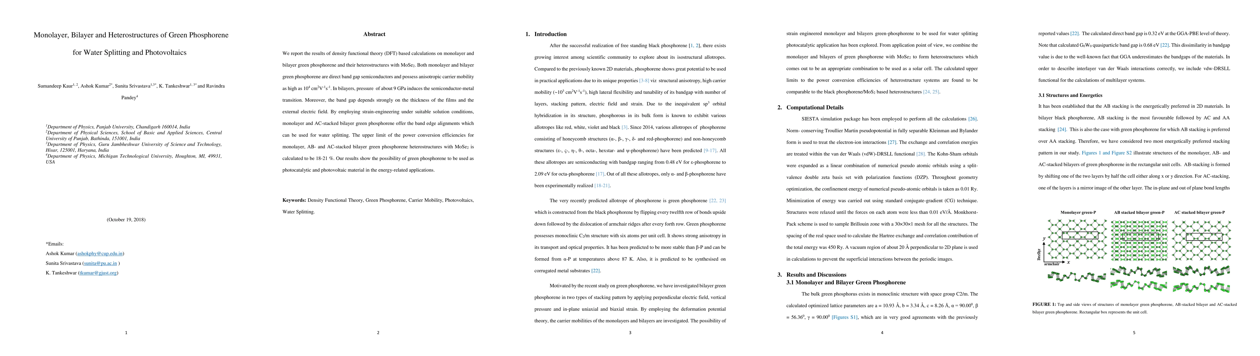 This study uses DFT calculations to explore monolayer and bilayer green phosphorene and their heterostructures with MoSe₂ for water splitting and photovoltaics. The materials show direct band gap semiconductor properties and high anisotropic carrier mobility, with potential for power conversion efficiencies up to 21%.