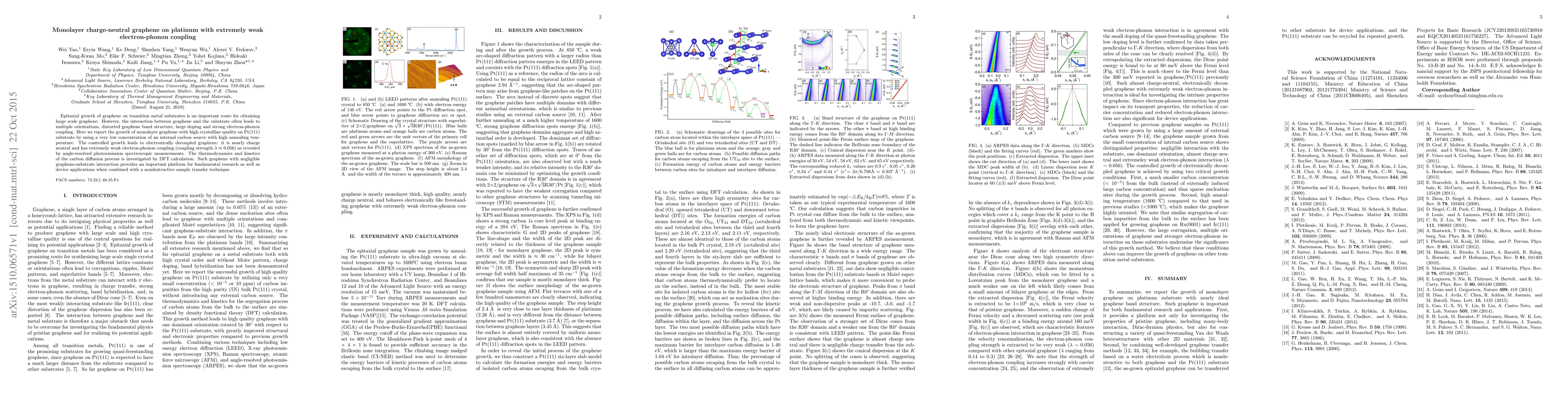 This research reports the epitaxial growth of high-quality, charge-neutral graphene on Pt(111) with minimal electron-phonon coupling, achieved through precise carbon source control and high annealing temperatures. The weak coupling and negligible doping make this graphene ideal for fundamental studies and device applications.