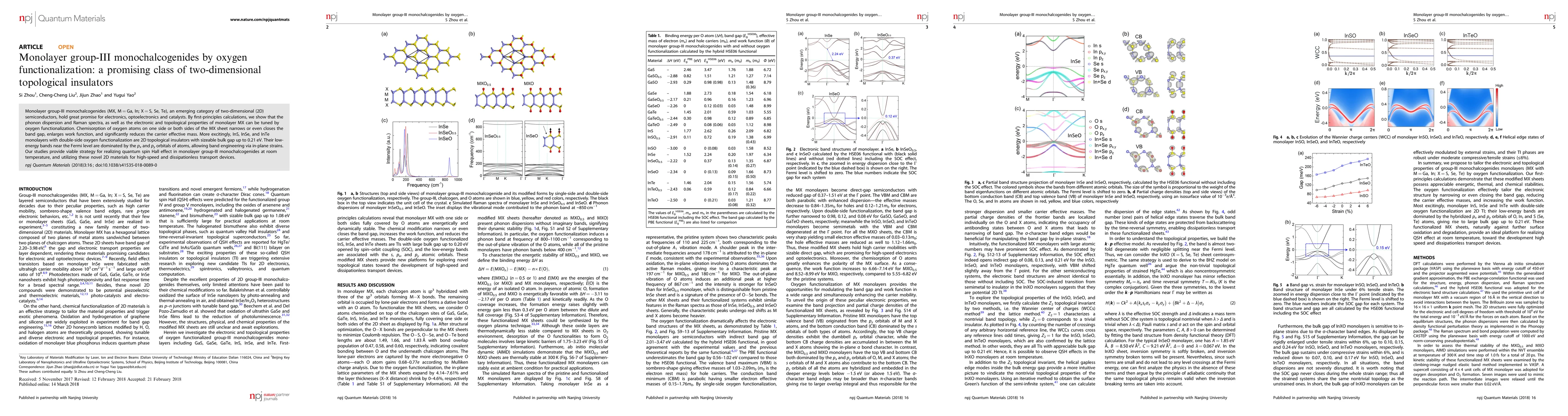 This paper demonstrates that oxygen functionalization can tune the electronic and topological properties of monolayer group-III monochalcogenides, turning InS, InSe, and InTe into 2D topological insulators with potential for quantum spin Hall effect and high-speed transport devices. The study provides a strategy for achieving these properties through first-principles calculations.