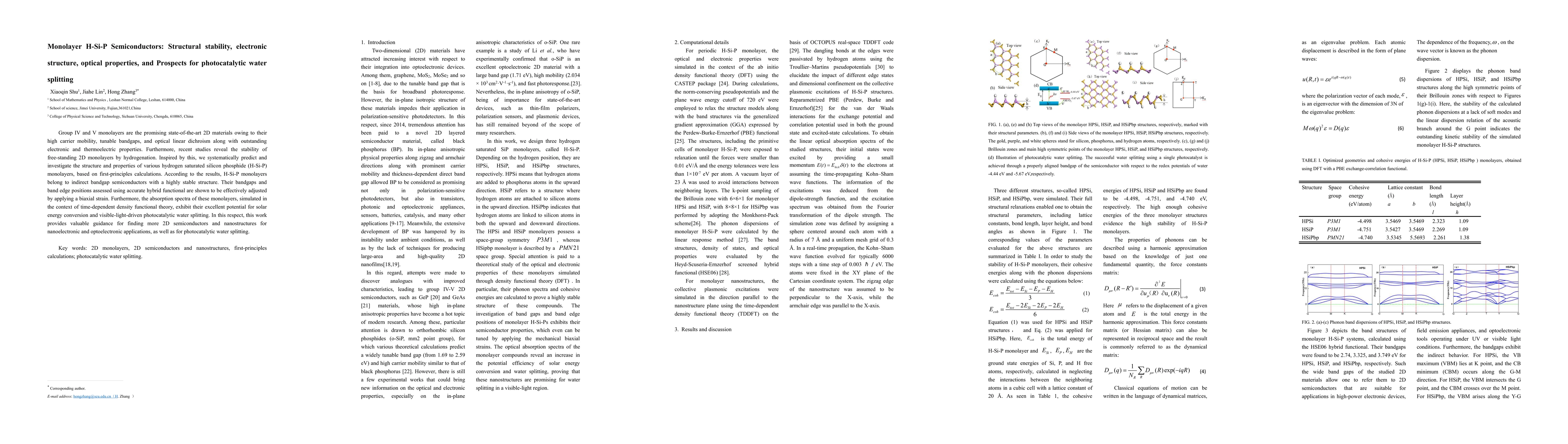 This paper investigates the structural stability, electronic structure, and optical properties of hydrogenated silicon phosphide (H-Si-P) monolayers using first-principles calculations. The findings reveal that H-Si-P monolayers are stable, indirect bandgap semiconductors whose bandgaps can be tuned by biaxial strain, making them promising for solar energy conversion and photocatalytic water splitting.