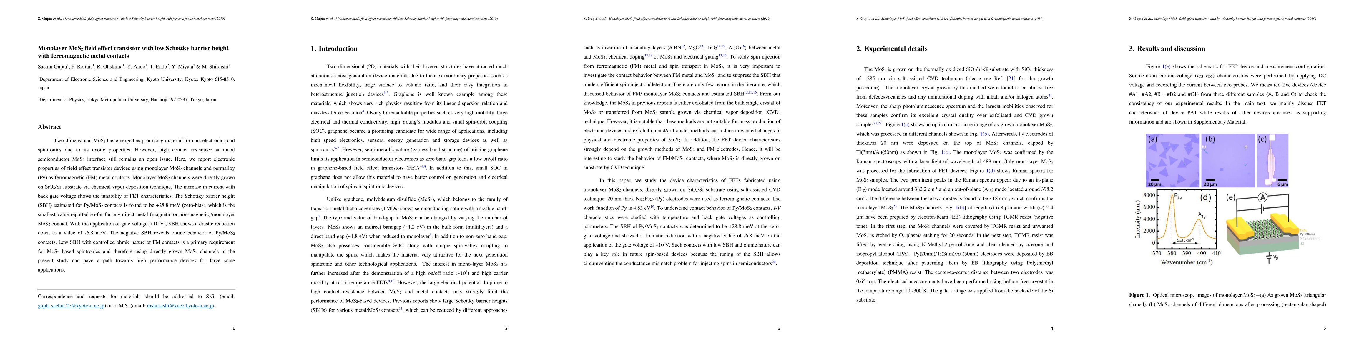 This study reports the electronic properties of monolayer MoS2 field effect transistors with permalloy contacts, achieving the lowest Schottky barrier height (SBH) reported to date at +28.8 meV, which further reduces to -6.8 meV under a gate voltage, indicating ohmic behavior and potential for high-performance spintronics applications.