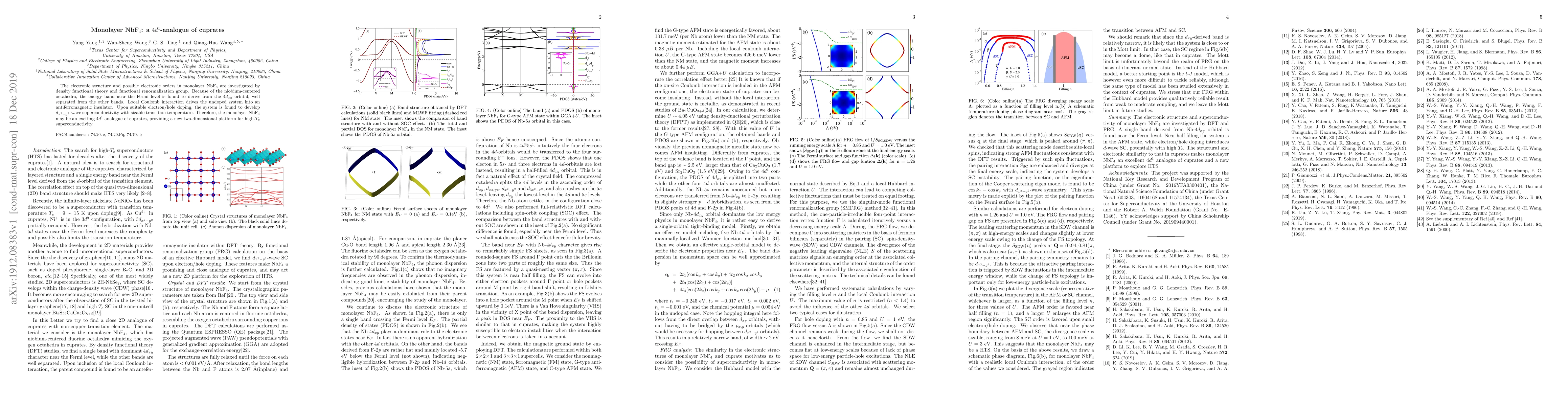 The electronic structure and possible electronic orders in monolayer NbF$_4$ are investigated by density functional theory and functional renormalization group. Because of the niobium-centered octahedra, the energy band near the Fermi level is found to derive from the $4d_{xy}$ orbital, well separated from the other bands. Local Coulomb interaction drives the undoped system into an antiferromagnetic insulator. Upon suitable electron/hole doping, the system is found to develop $d_{x^2-y^2}$-wave superconductivity with sizable transition temperature. Therefore, the monolayer NbF$_4$ may be an exciting $4d^1$ analogue of cuprates, providing a new two-dimensional platform for high-$T_c$ superconductivity.