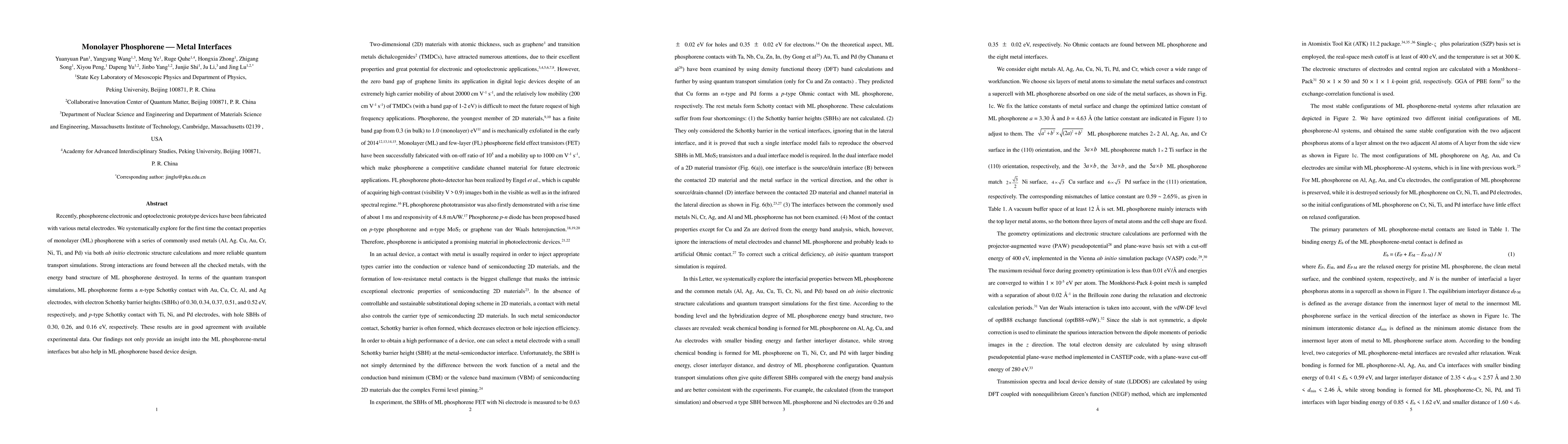 This study investigates the electronic properties of monolayer phosphorene interfaces with various metals using ab initio calculations and quantum transport simulations. The results reveal strong interactions leading to the disruption of phosphorene's band structure, forming n-type Schottky contacts with Au, Cu, Cr, Al, and Ag, and p-type Schottky contacts with Ti, Ni, and Pd, providing valuable insights for phosphorene-based device design.