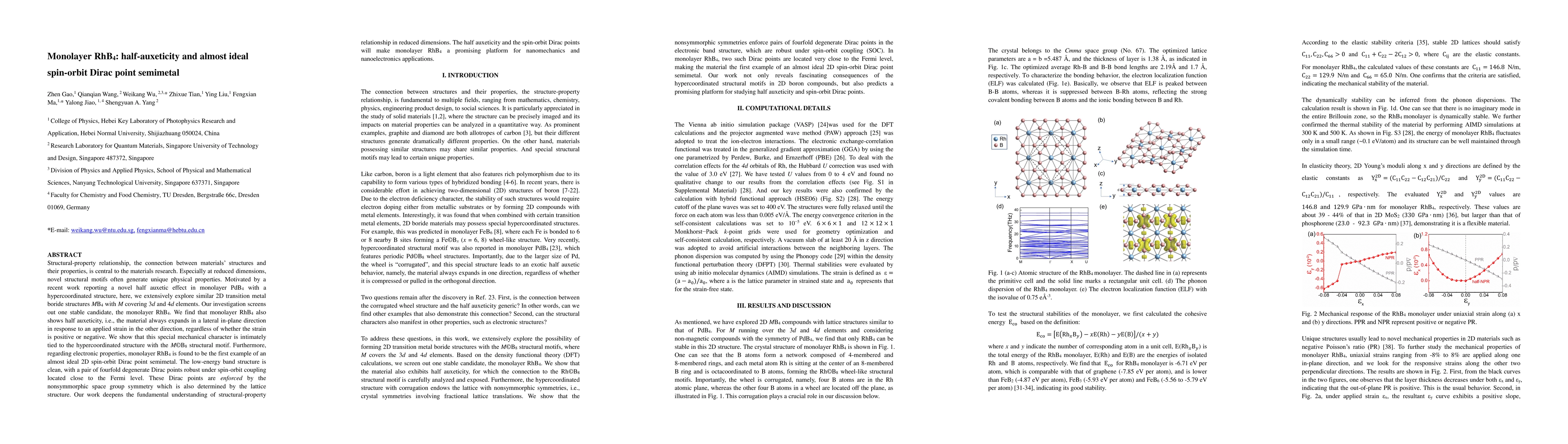 Monolayer RhB4 exhibits unique half auxeticity and an almost ideal spin-orbit Dirac point semimetal behavior, driven by its hypercoordinated M\c{opyright}B8 structure. These properties position it as a promising material for nanomechanics and nanoelectronics applications.