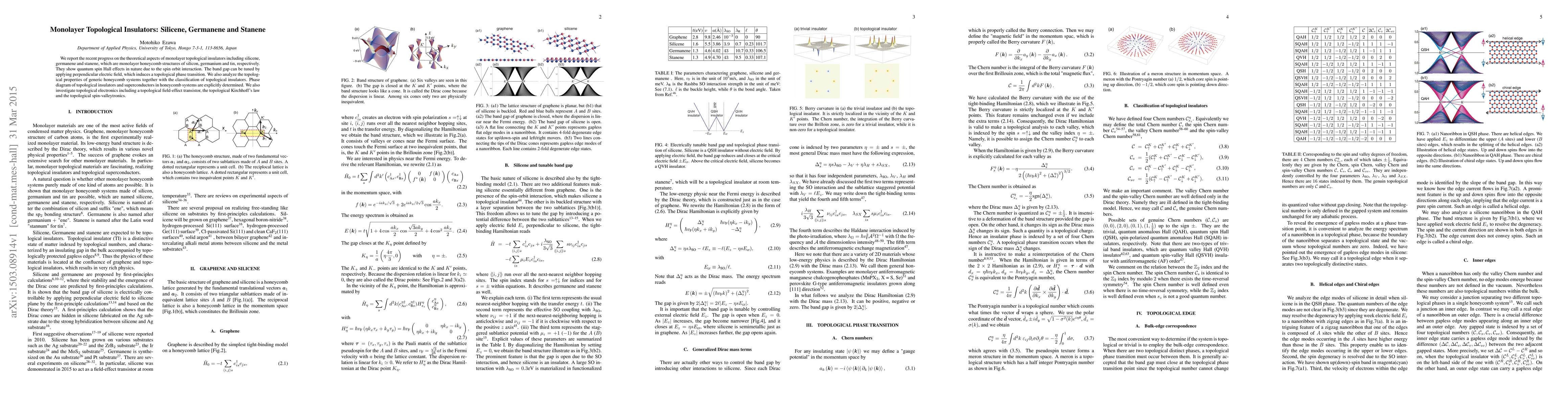 This paper reviews theoretical advancements in monolayer topological insulators like silicene, germanene, and stanene, emphasizing their quantum spin Hall effects and tunable band gaps. It explores topological properties, phase diagrams, and applications in topological electronics.