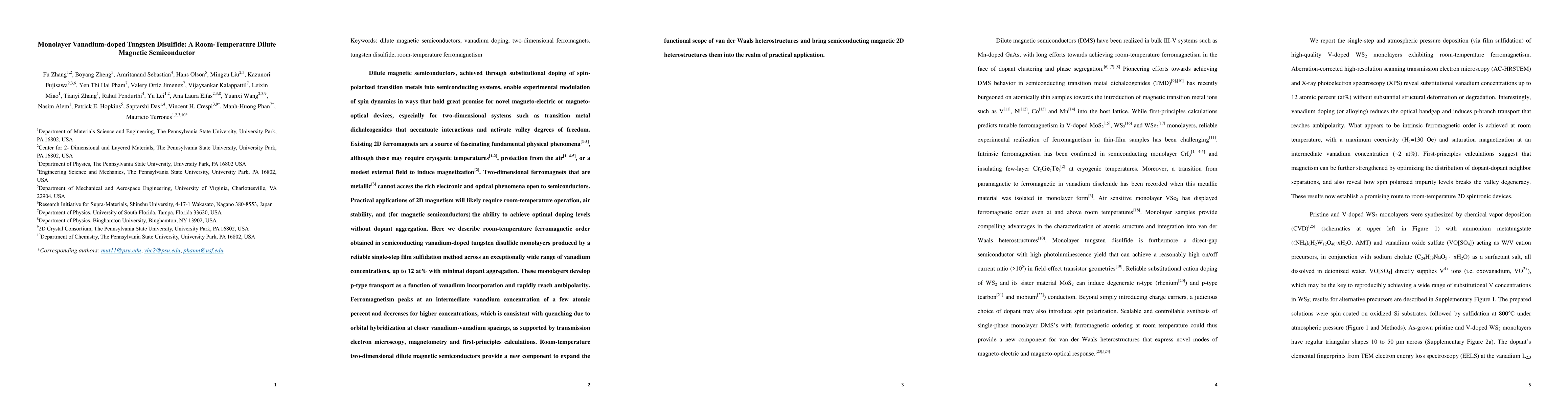 This paper reports the successful fabrication of room-temperature ferromagnetic monolayers of vanadium-doped tungsten disulfide using a single-step sulfidation method, achieving optimal doping levels up to 12 at% with minimal aggregation. These materials exhibit p-type transport and potential for practical applications in magneto-electric or magneto-optical devices.