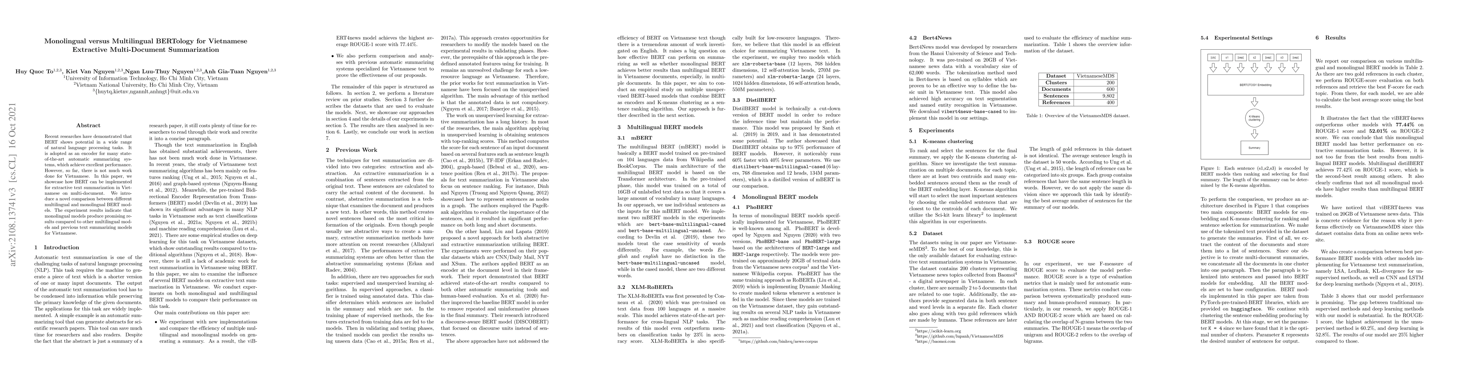 This paper compares monolingual and multilingual BERT models for Vietnamese multi-document extractive summarization. The results show that monolingual BERT models outperform multilingual BERT models and previous summarization techniques for Vietnamese.