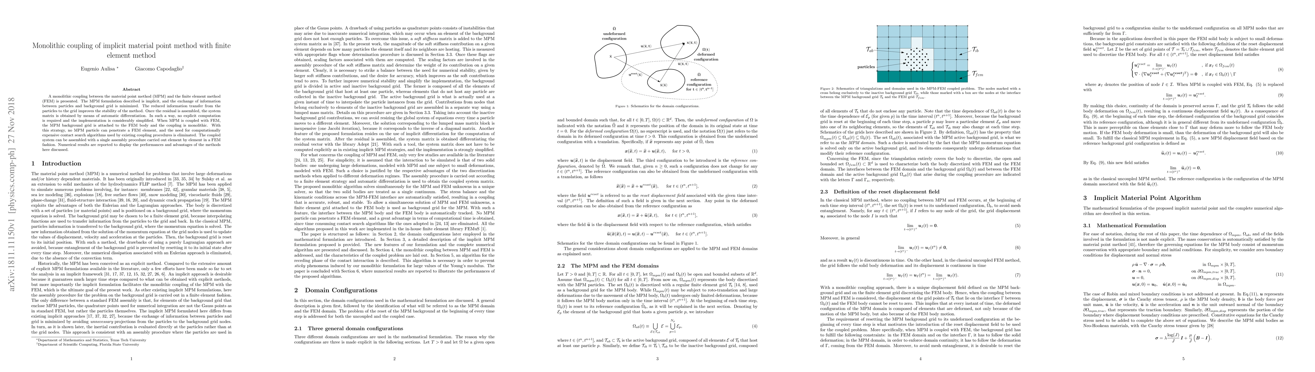 This paper presents a monolithic coupling of the implicit material point method (MPM) with the finite element method (FEM), minimizing information transfer to enhance stability. The coupling avoids computationally expensive contact algorithms and uses automatic differentiation for system matrix computation, simplifying the implementation.
