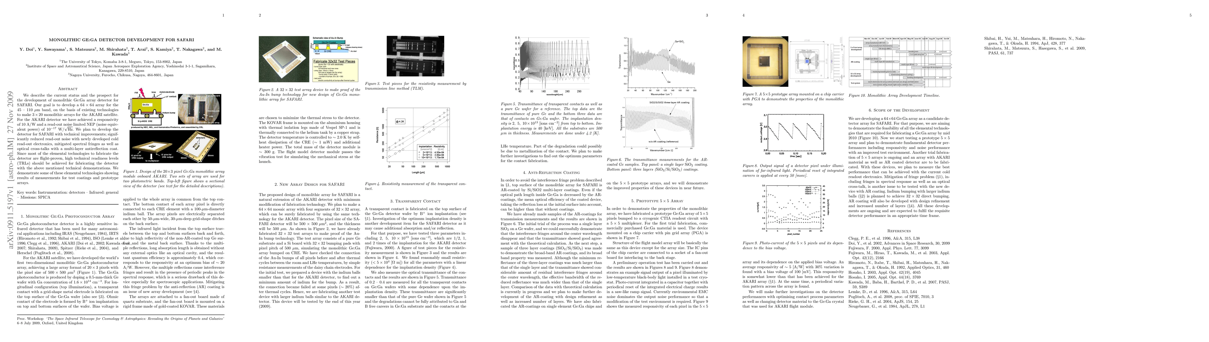 We describe the current status and the prospect for the development of monolithic Ge:Ga array detector for SAFARI. Our goal is to develop a 64x64 array for the 45 -- 110 um band, on the basis of existing technologies to make 3x20 monolithic arrays for the AKARI satellite. For the AKARI detector we have achieved a responsivity of 10 A/W and a read-out noise limited NEP (noise equivalent power) of 10^-17 W/rHz. We plan to develop the detector for SAFARI with technical improvements; significantly reduced read-out noise with newly developed cold read-out electronics, mitigated spectral fringes as well as optical cross-talks with a multi-layer antireflection coat. Since most of the elemental technologies to fabricate the detector are flight-proven, high technical readiness levels (TRLs) should be achieved for fabricating the detector with the above mentioned technical demonstrations. We demonstrate some of these elemental technologies showing results of measurements for test coatings and prototype arrays.
