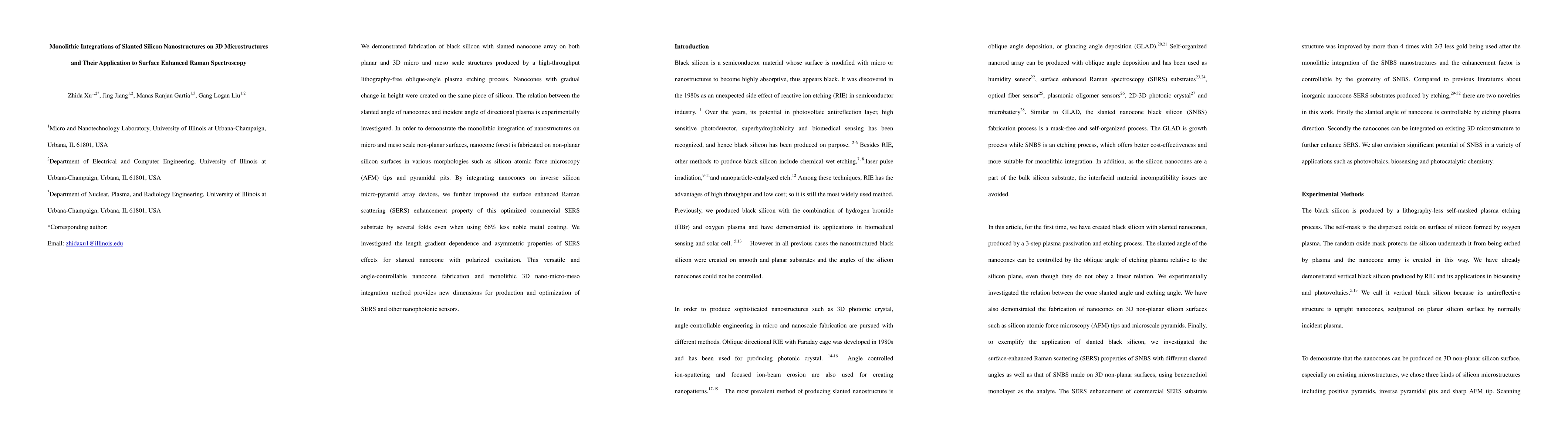 This paper details the fabrication of slanted silicon nanocone arrays on both planar and 3D microstructures using a lithography-free etching process, and demonstrates their application in enhancing surface-enhanced Raman spectroscopy (SERS) efficiency. The integration of these nanostructures on non-planar surfaces significantly improves SERS performance with reduced noble metal coating.